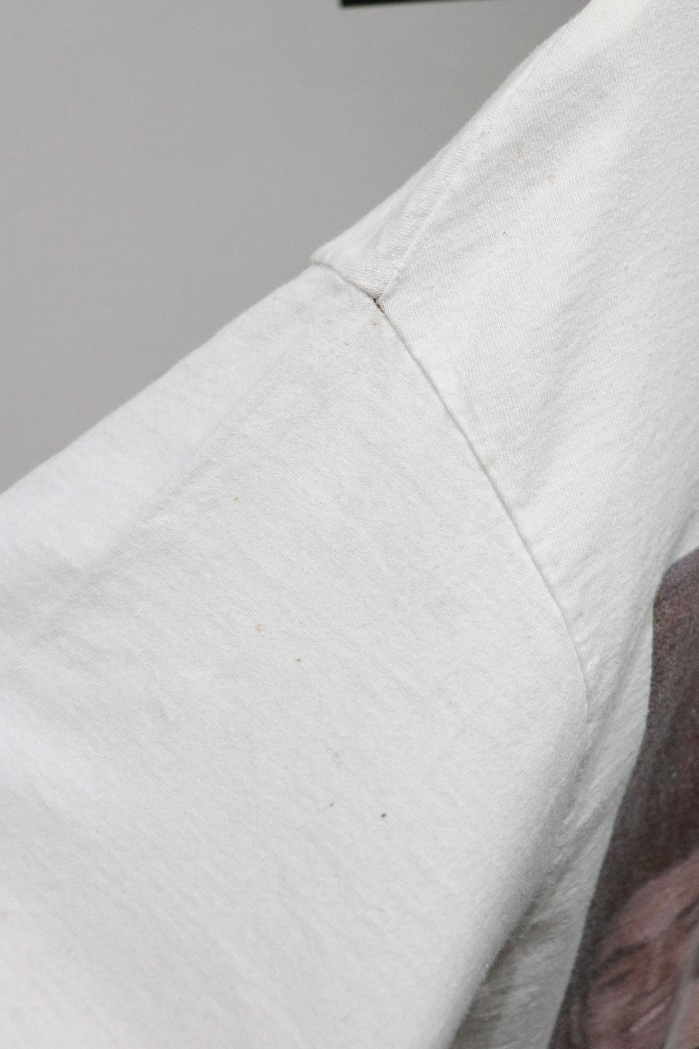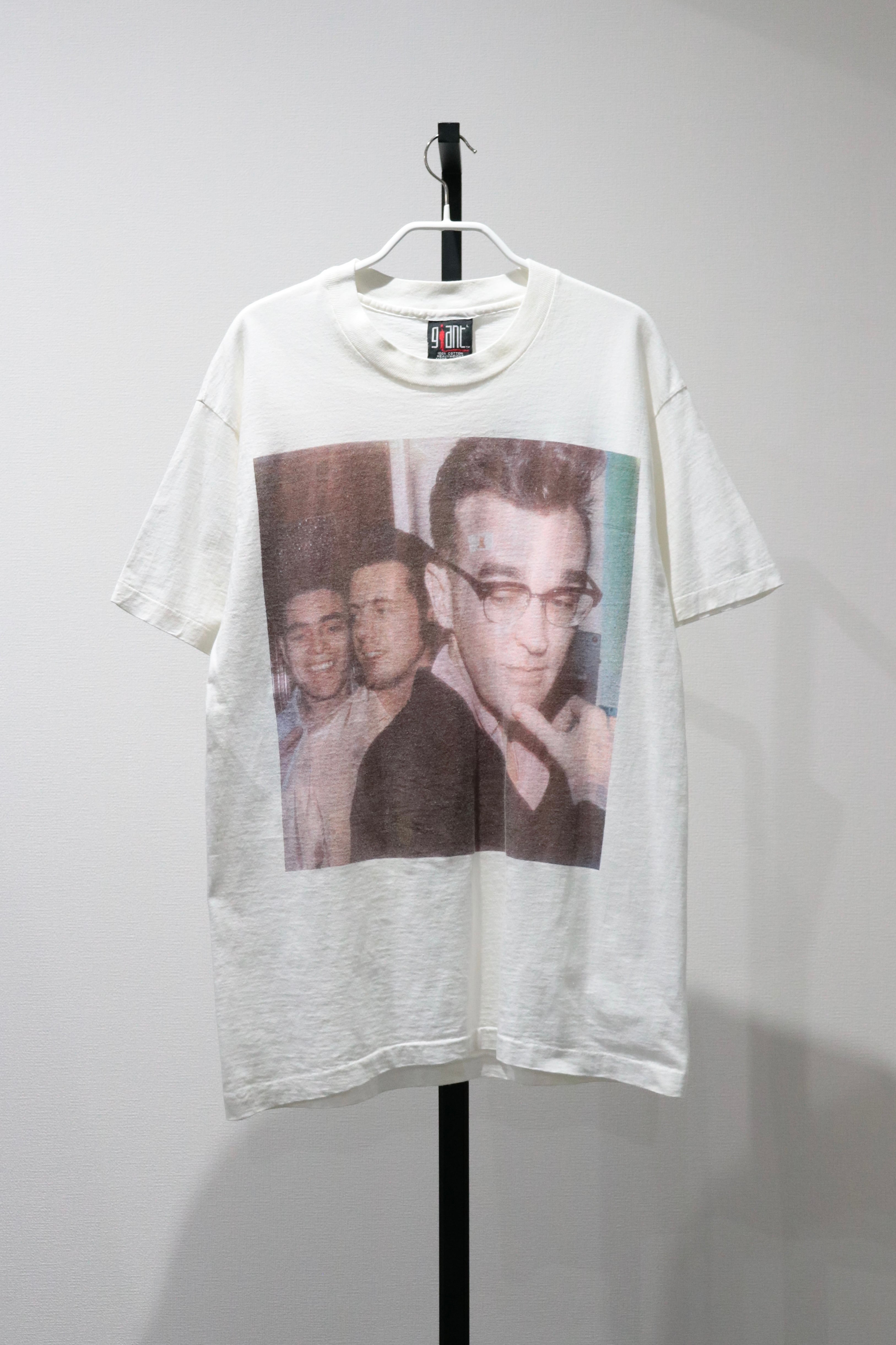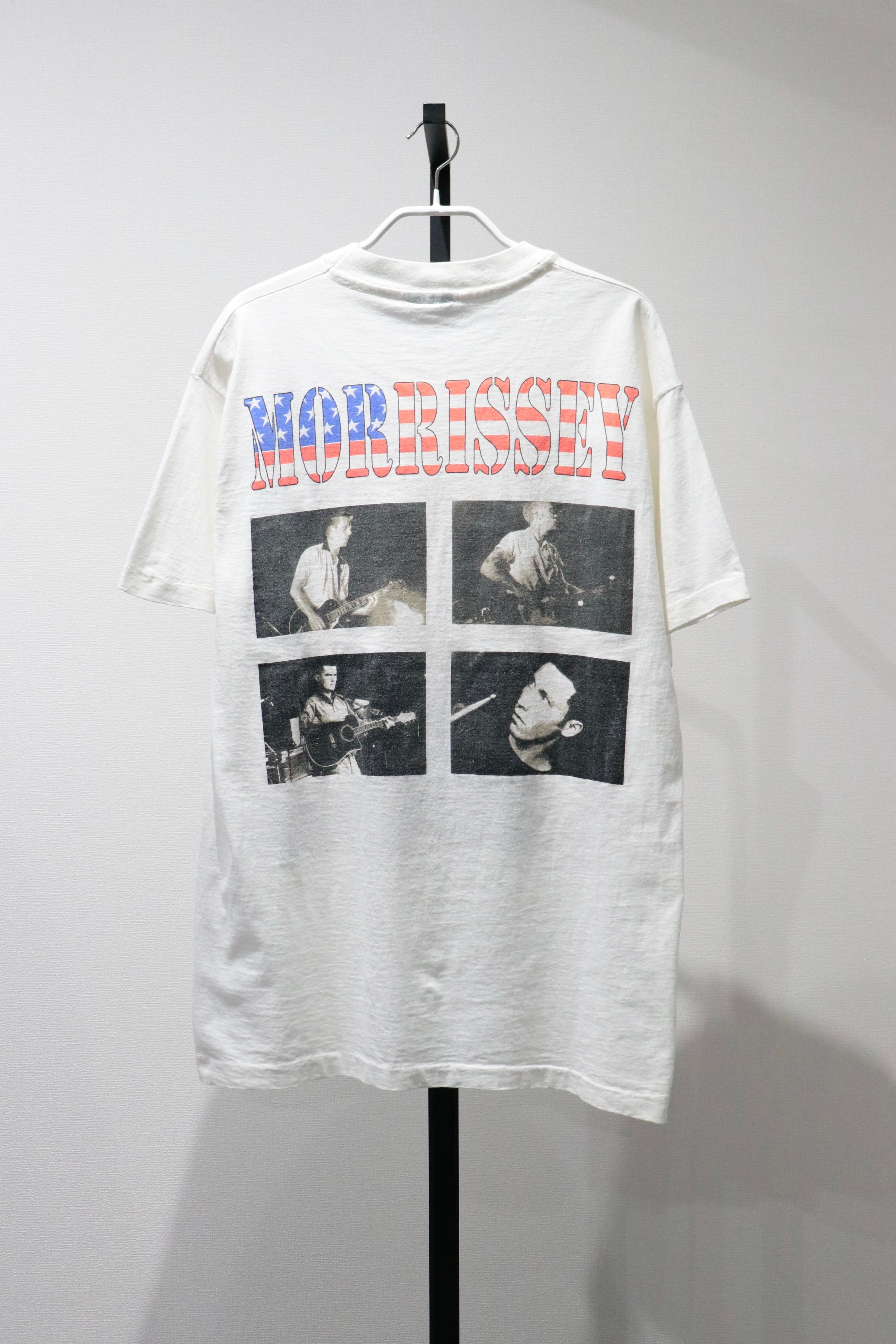 背中の「MORRISSEY」の文字が星条旗カラーになった、90年ごろのアメリカツアーのものだと思われます。前はおしゃれなフォトプリント。袖、裾はシングルステッチです。
