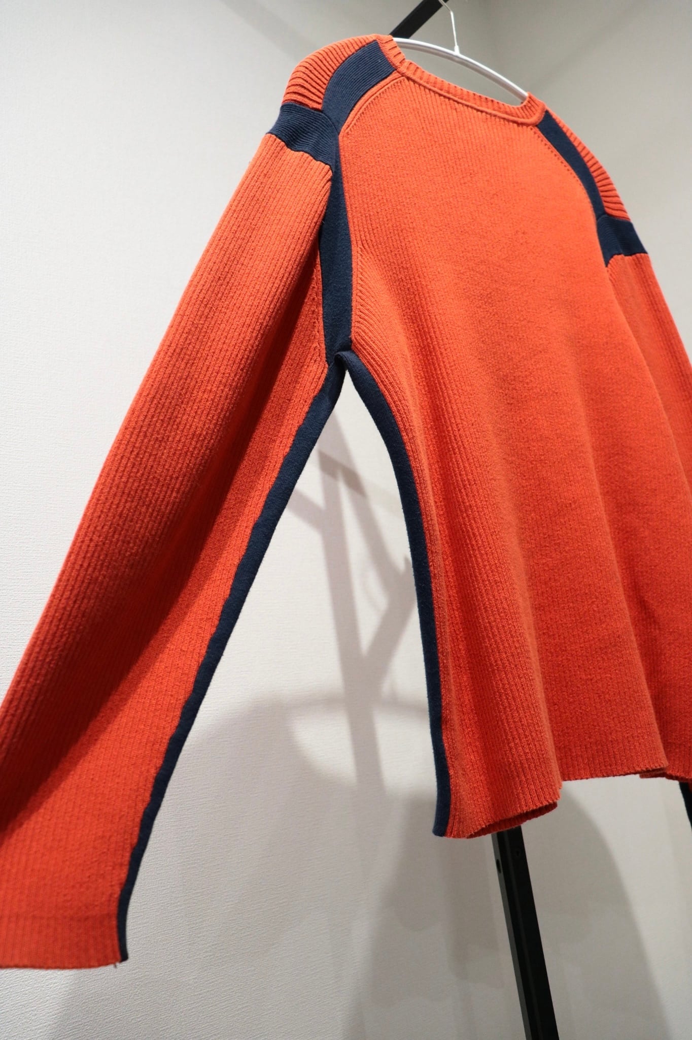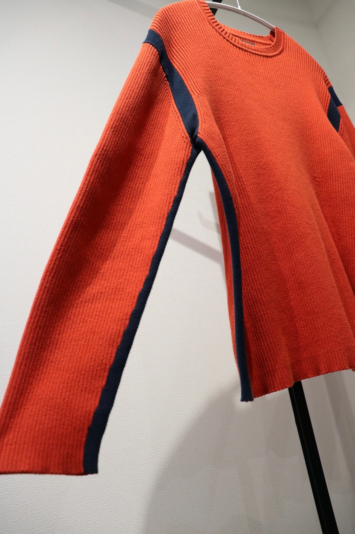 オレンジカラーにネイビーのラインデザインがおしゃれなコットンニット。