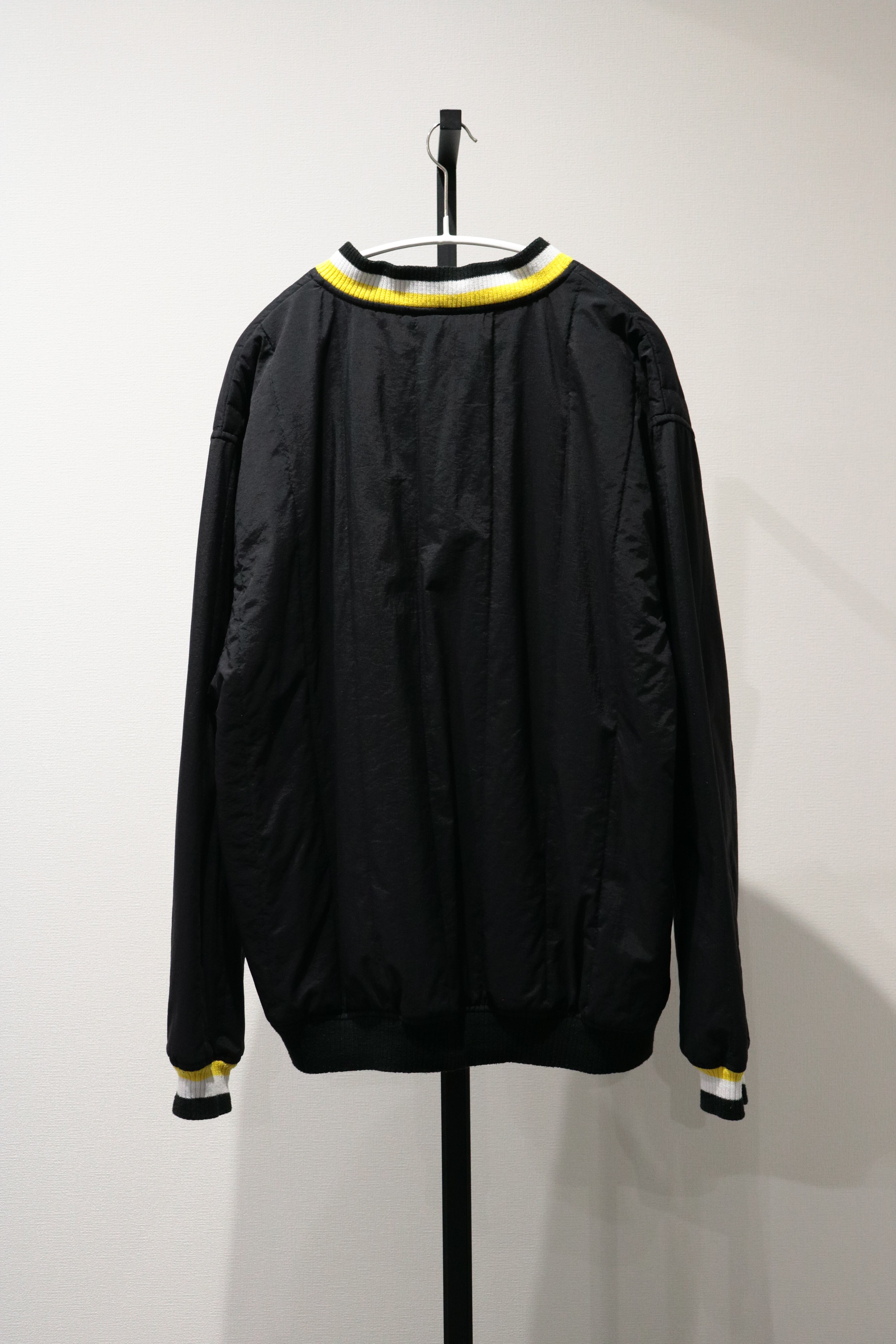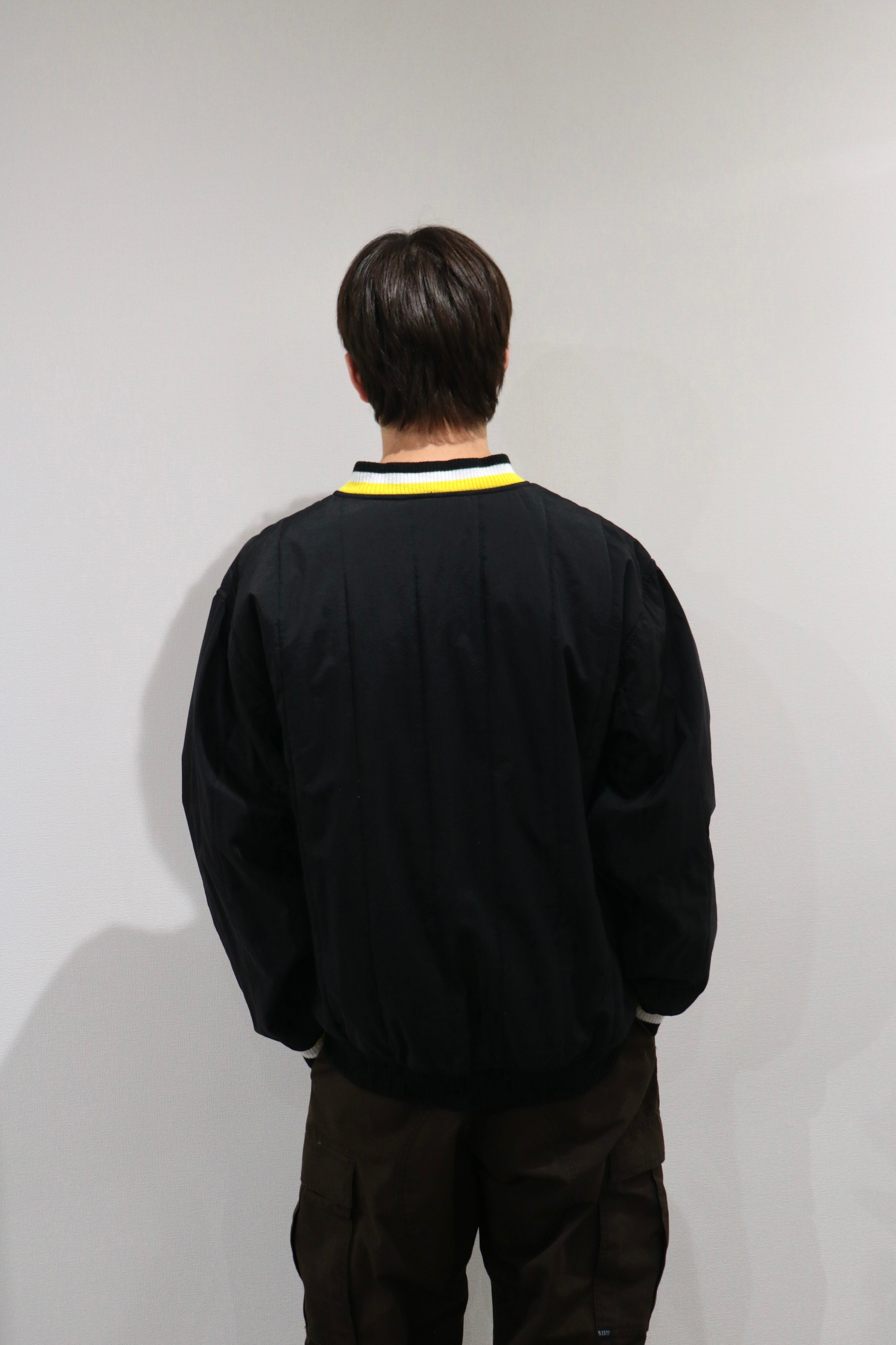 ブラックボディにホワイト×イエローのラインリブが付いた、Vネックタイプの一着です。左胸にはゴム製のロゴパッチ付き。