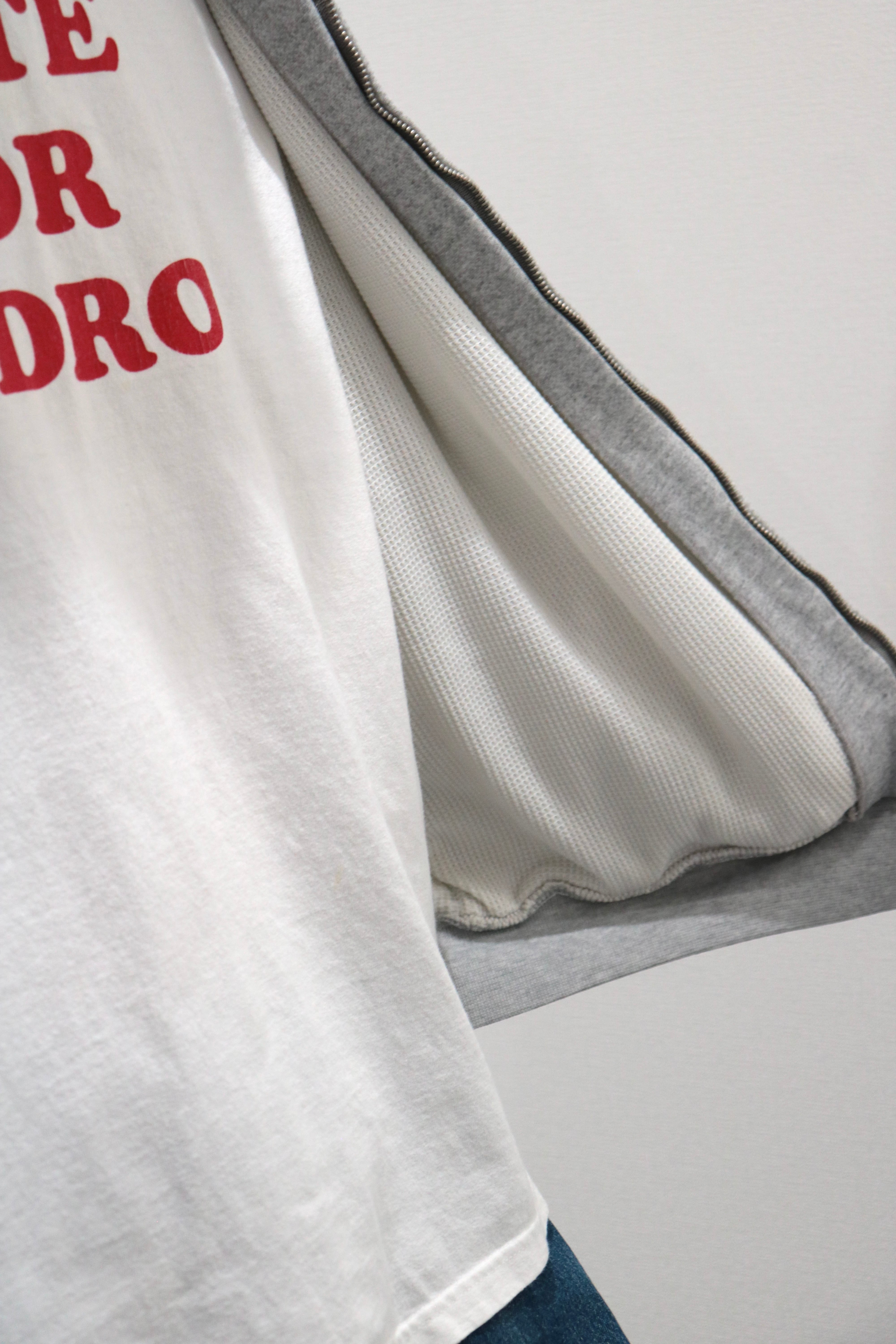 裏サーマルのフルジップパーカー。ベーシックな杢グレーであったかくて、使い勝手のいい万能アイテムです。サイズもXLでゆったり着ていただけます。