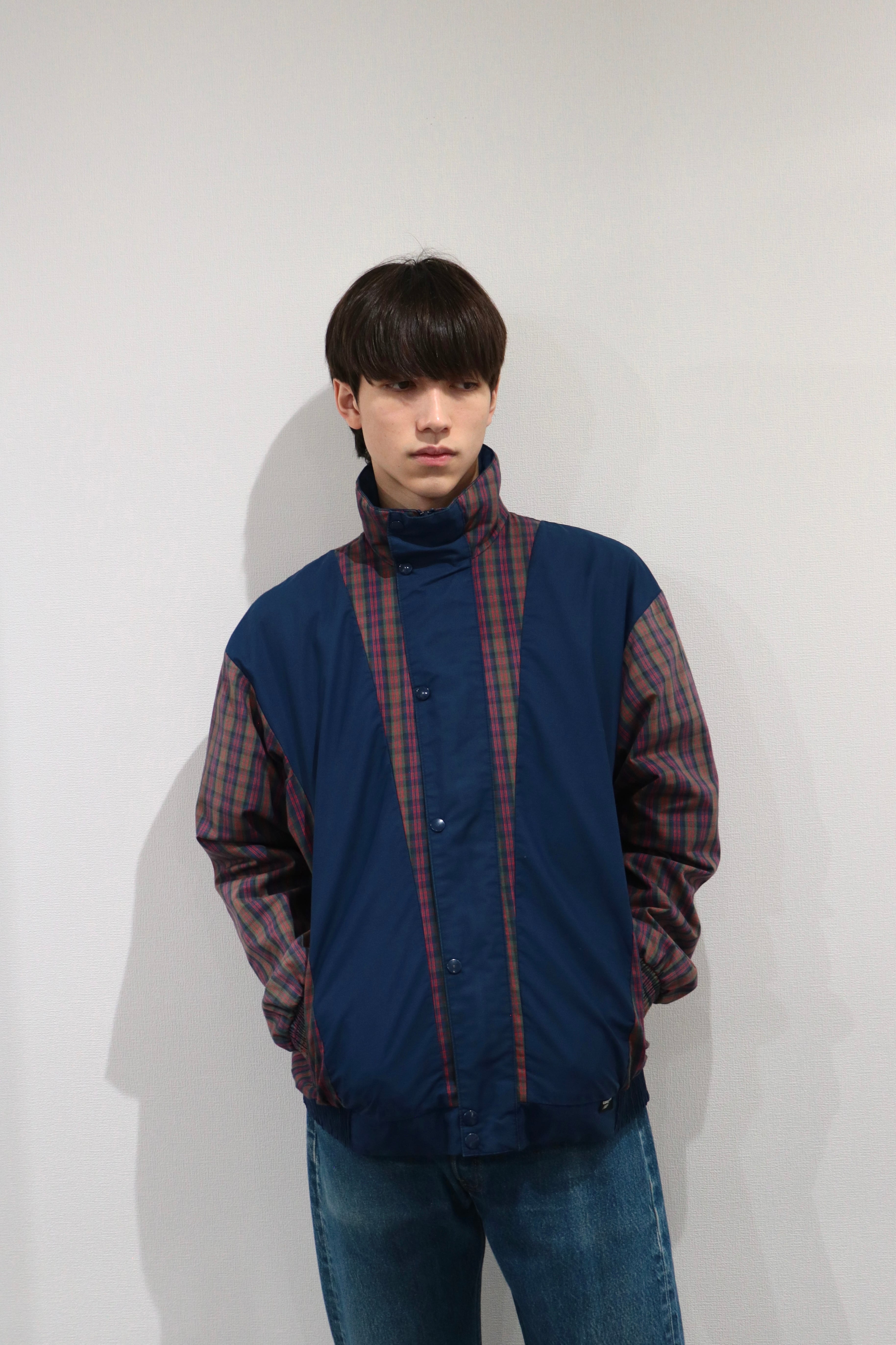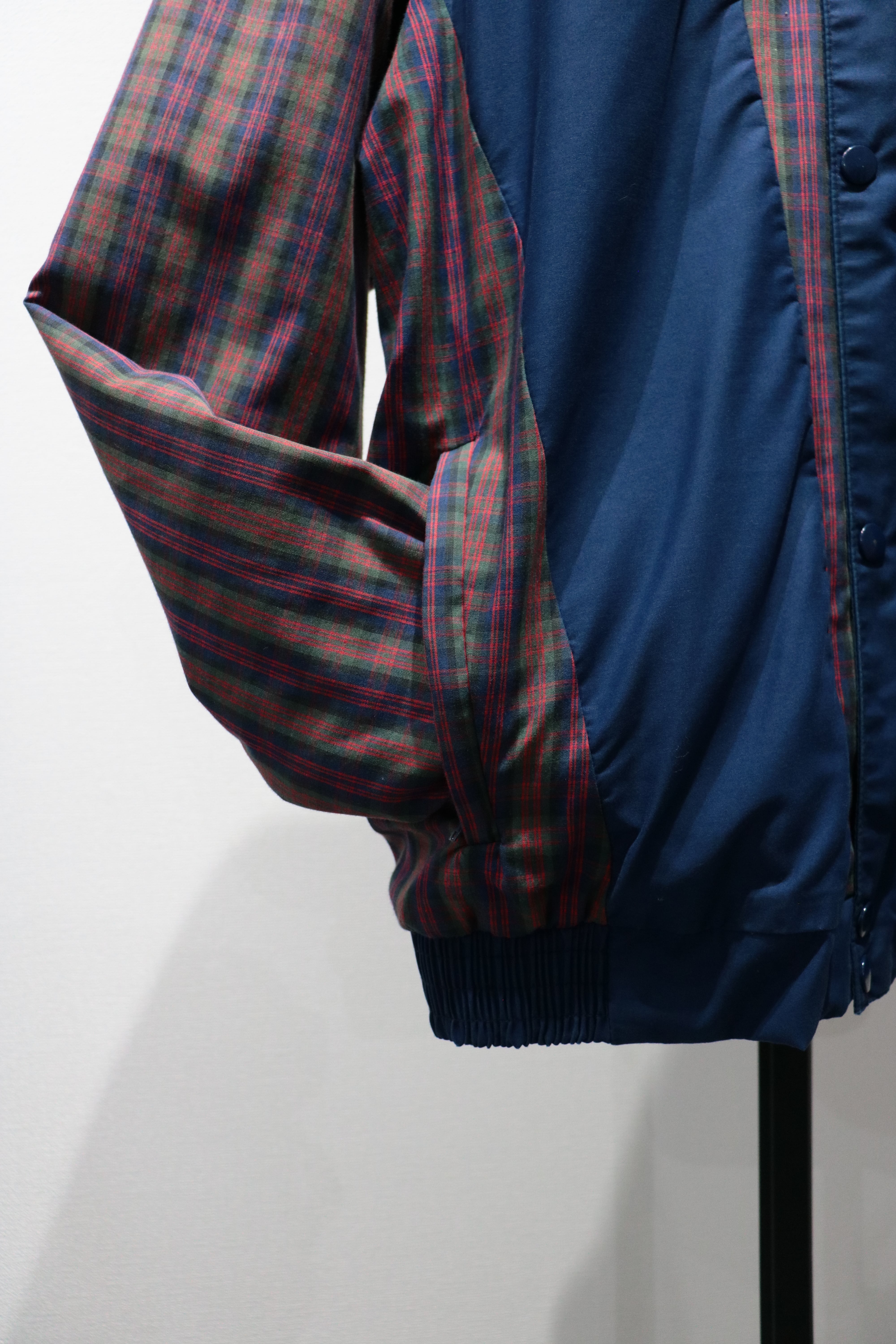 無地ネイビーとチェック柄で切り替えられたデザインジャケット。