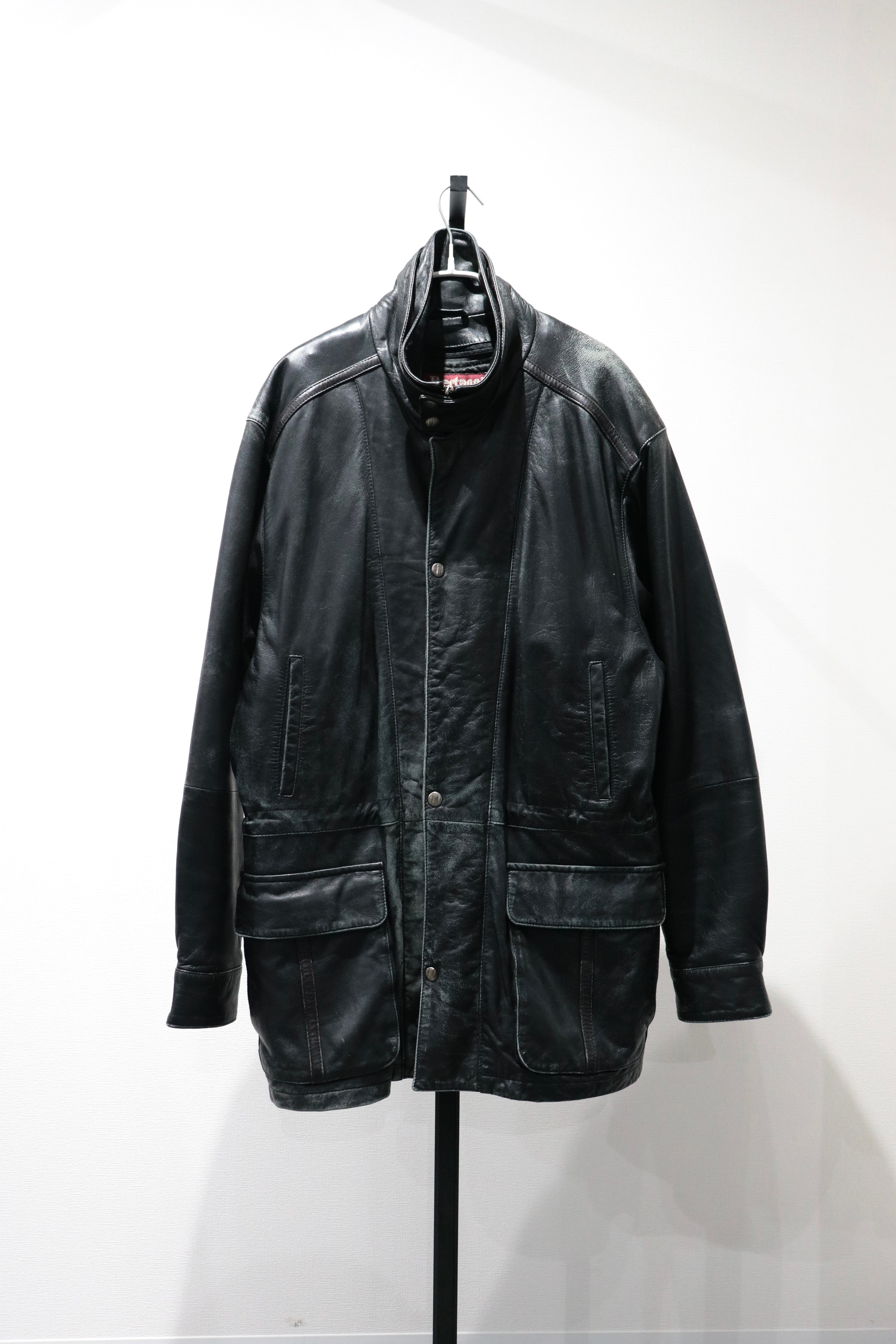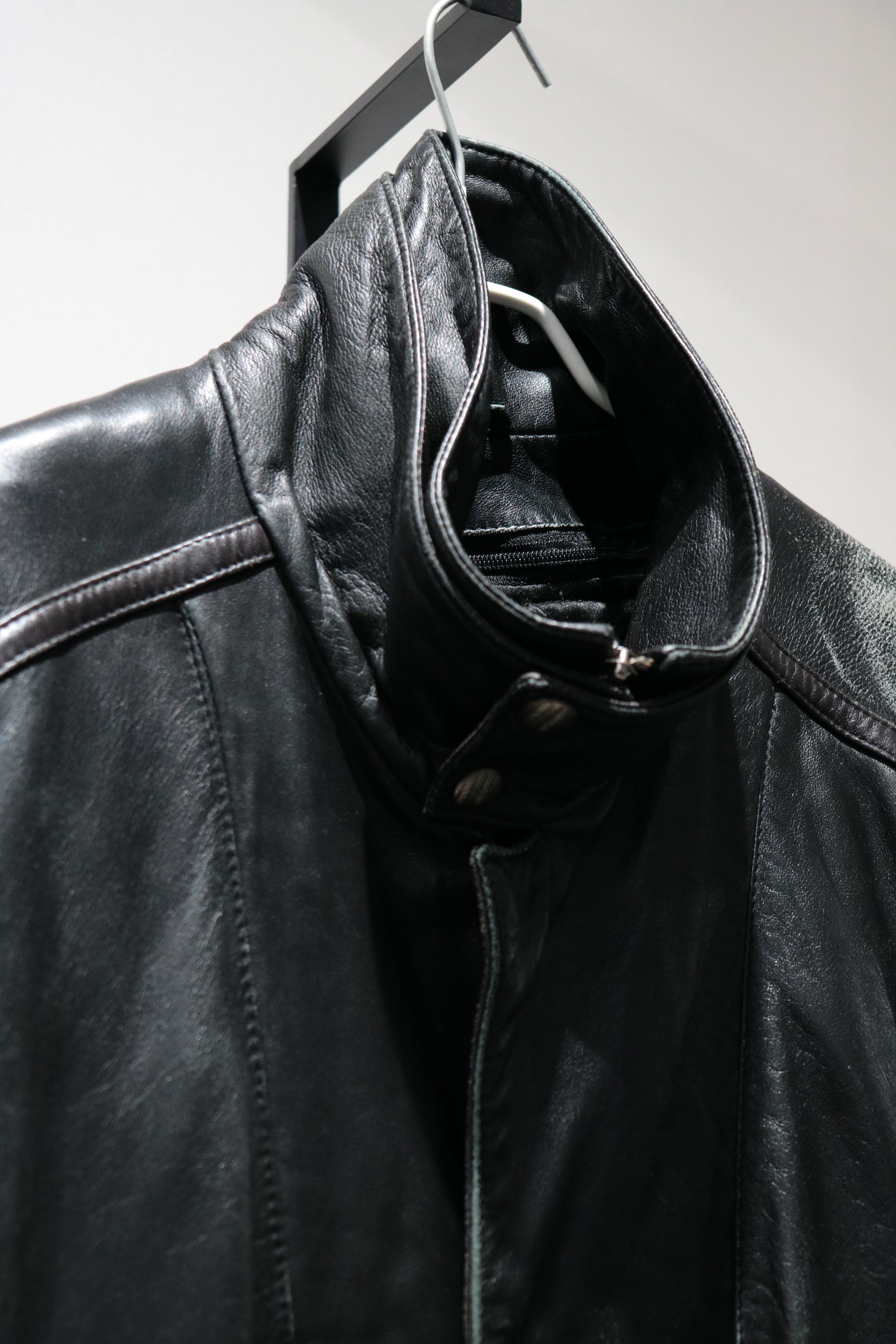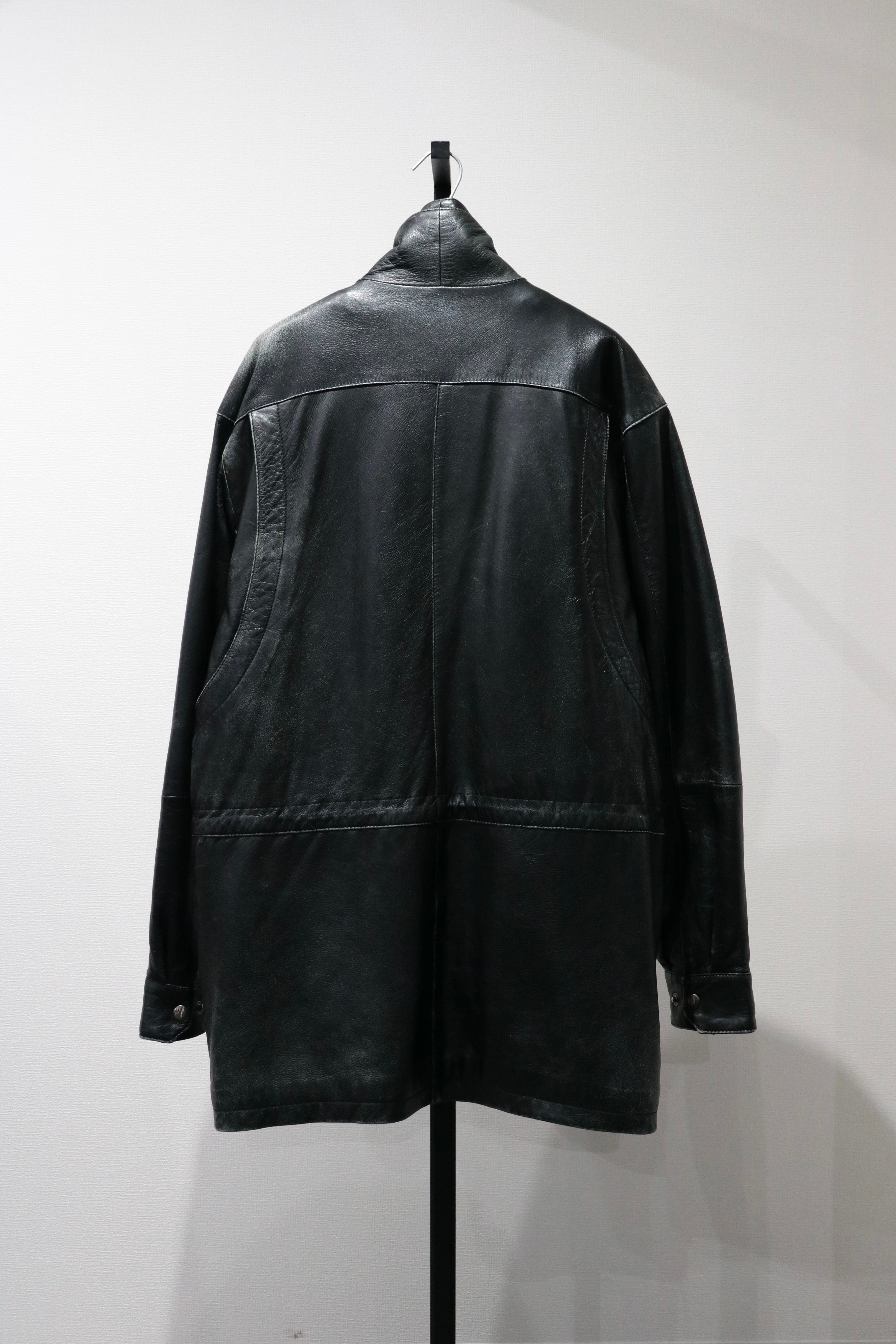 やや長めの着丈で、ハイネック仕様のレザージャケット。