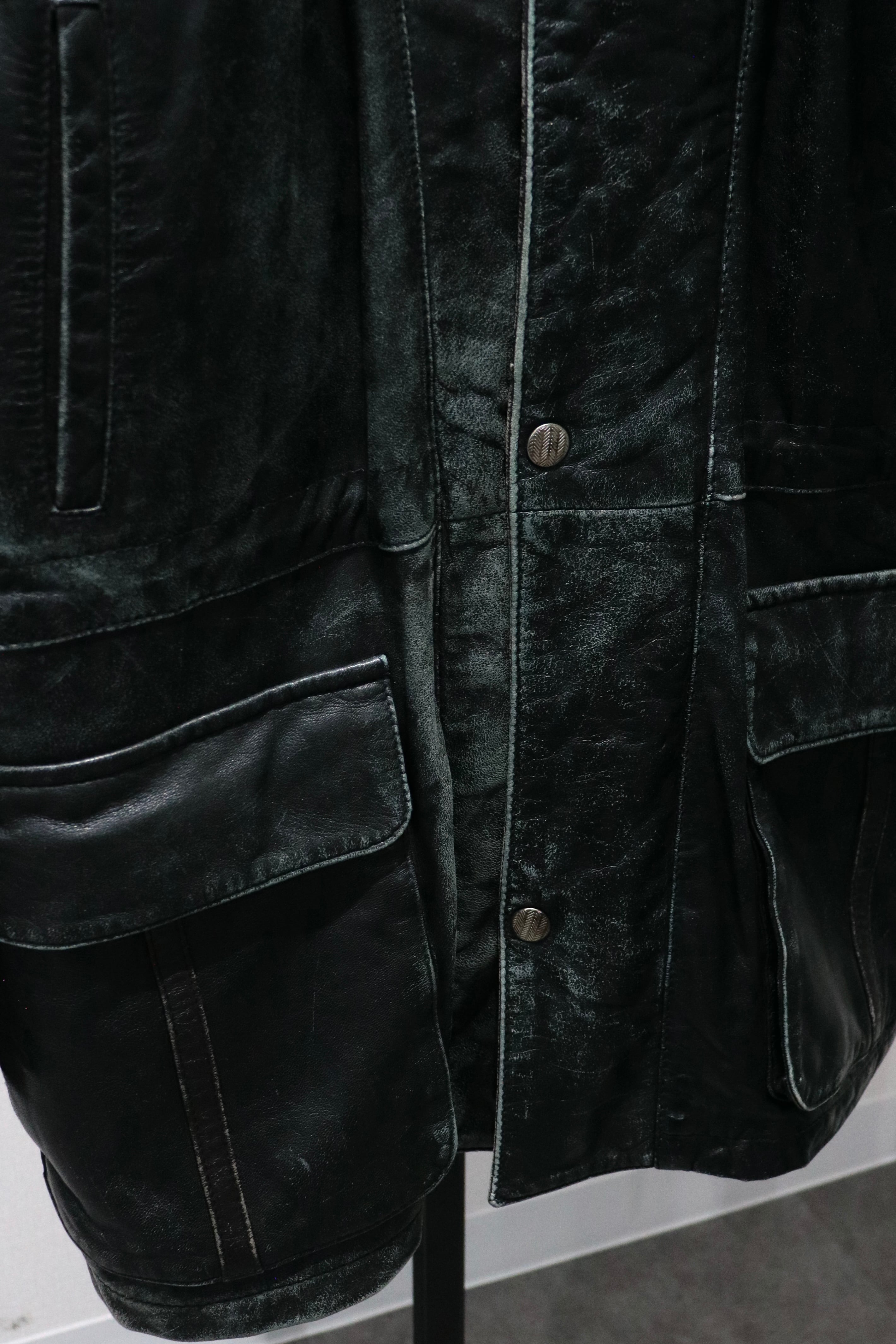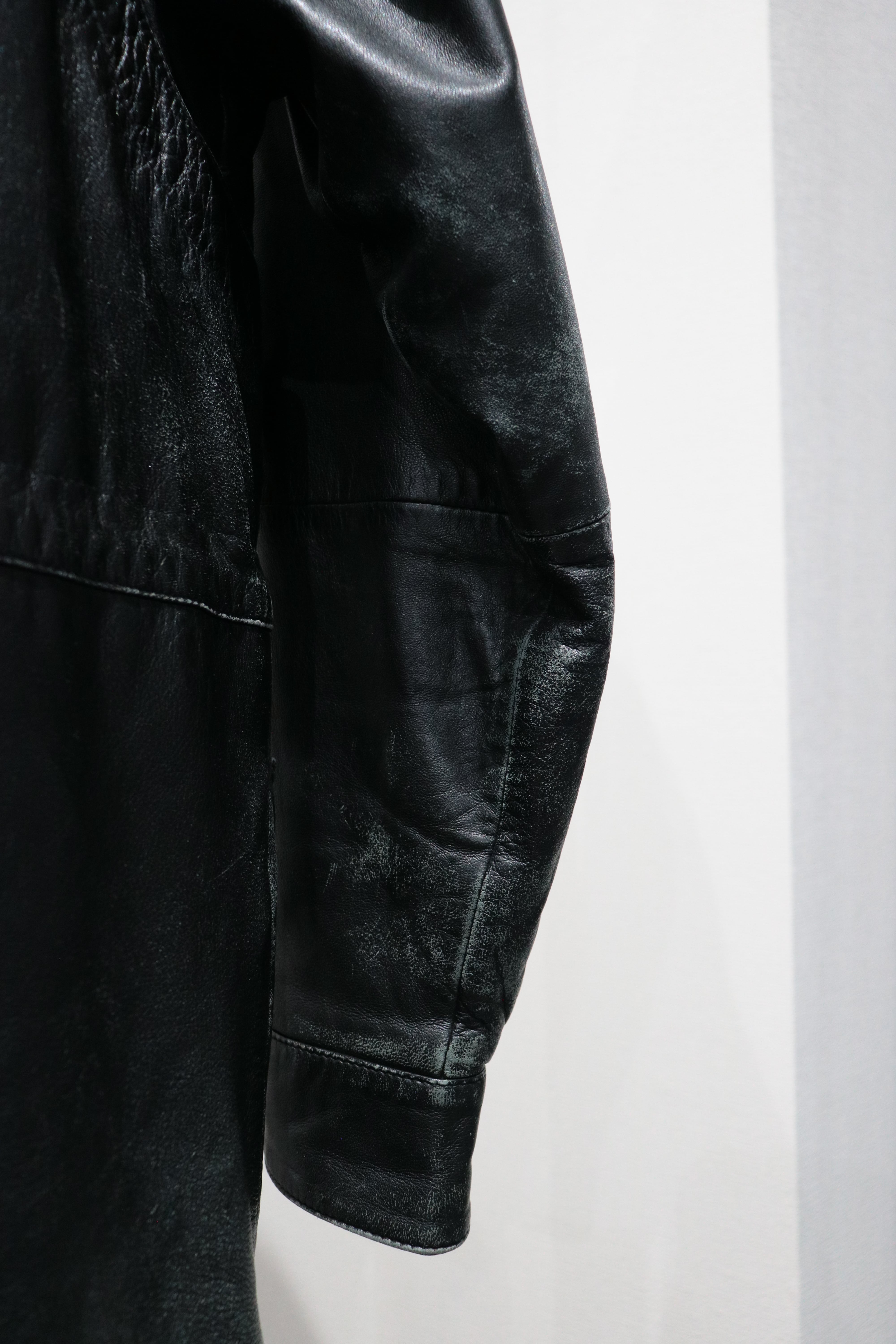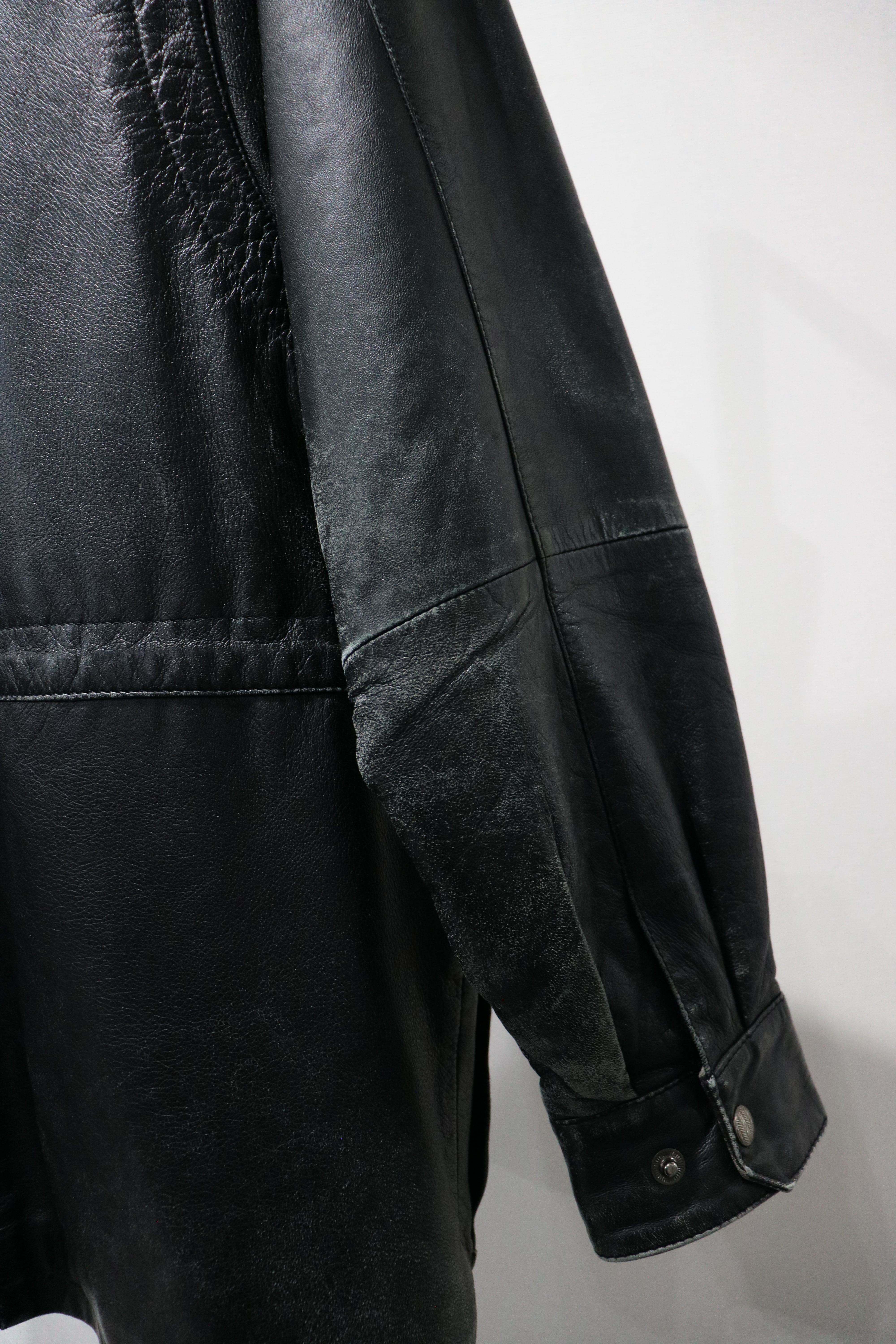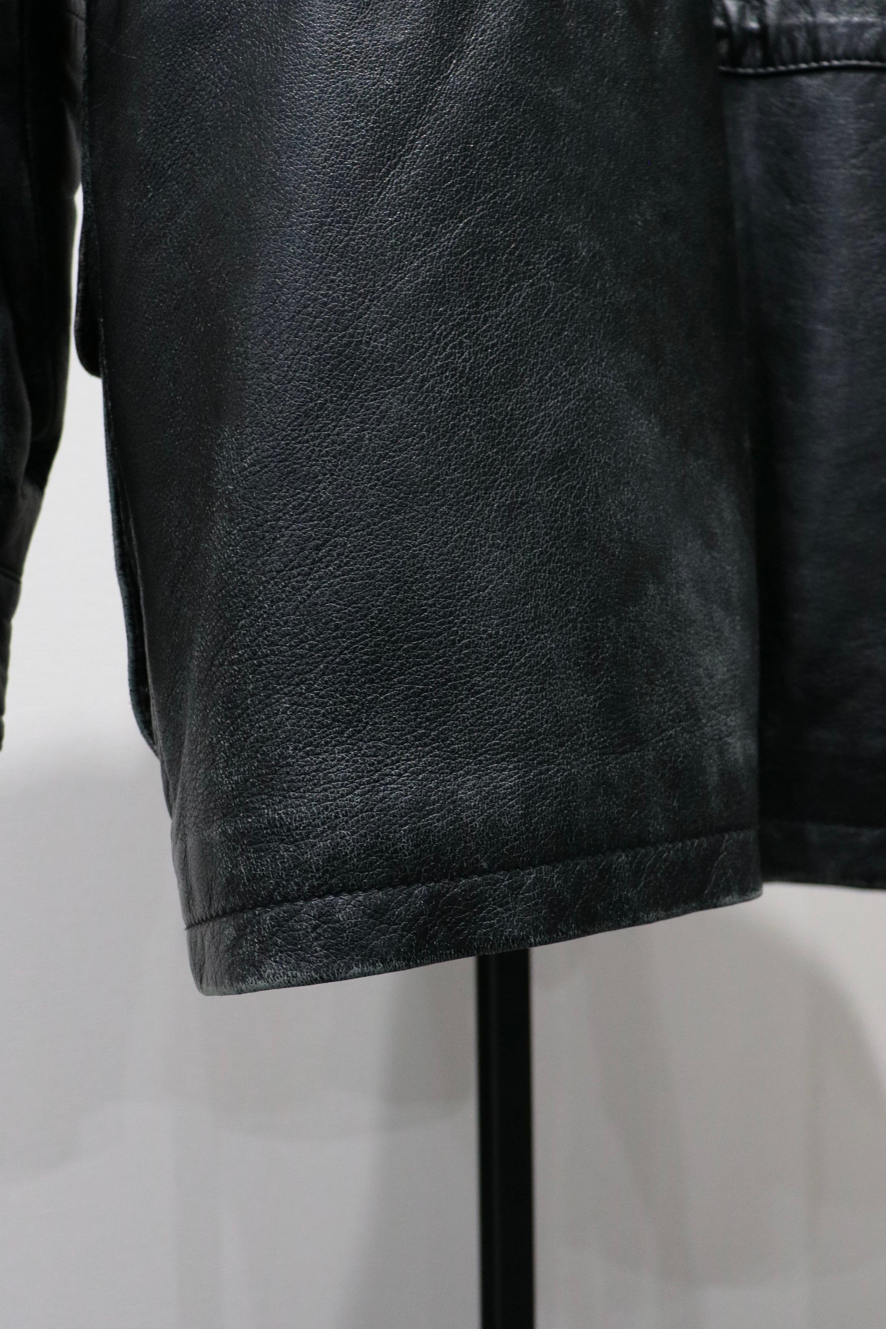 やや長めの着丈で、ハイネック仕様のレザージャケット。