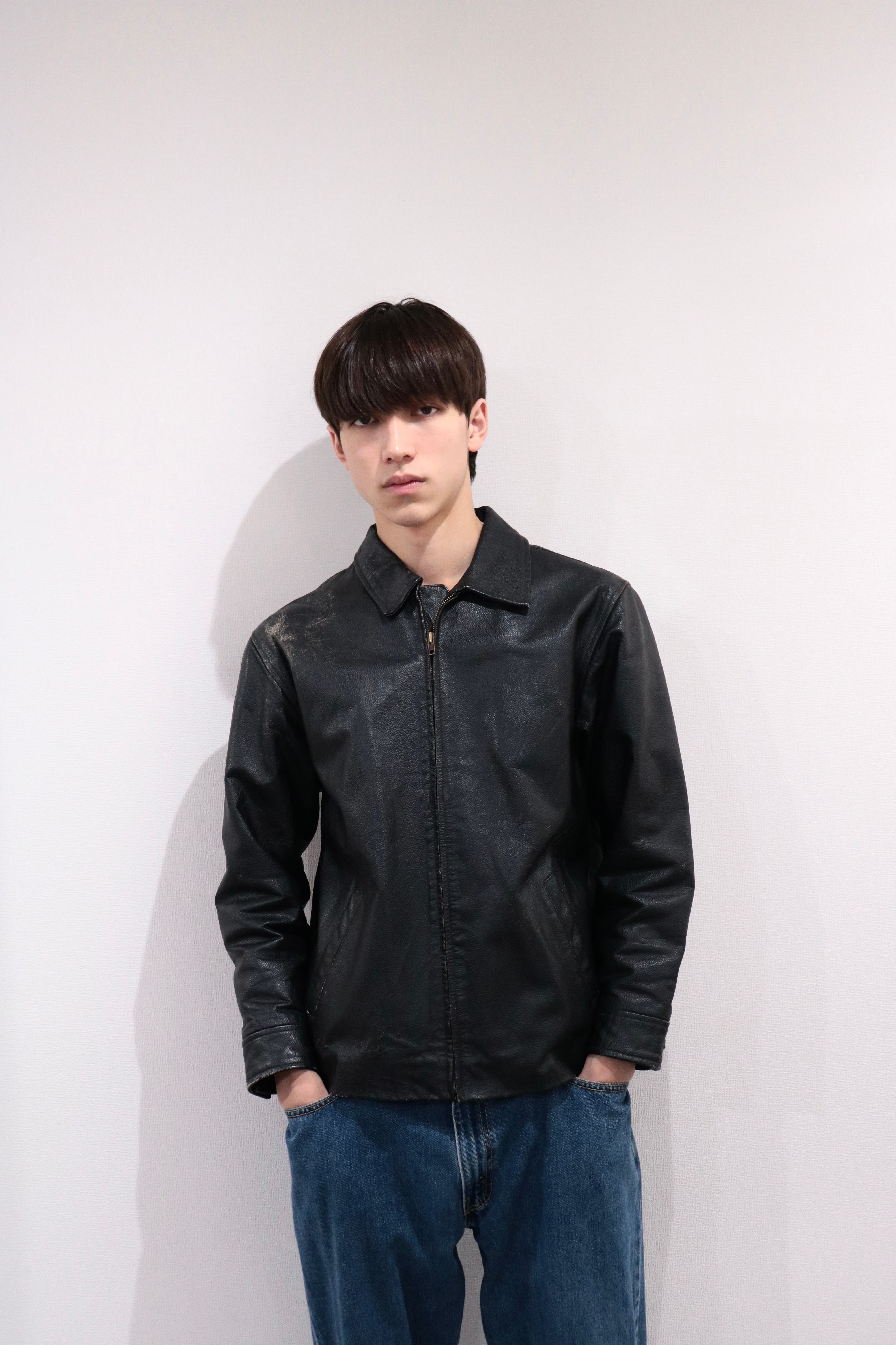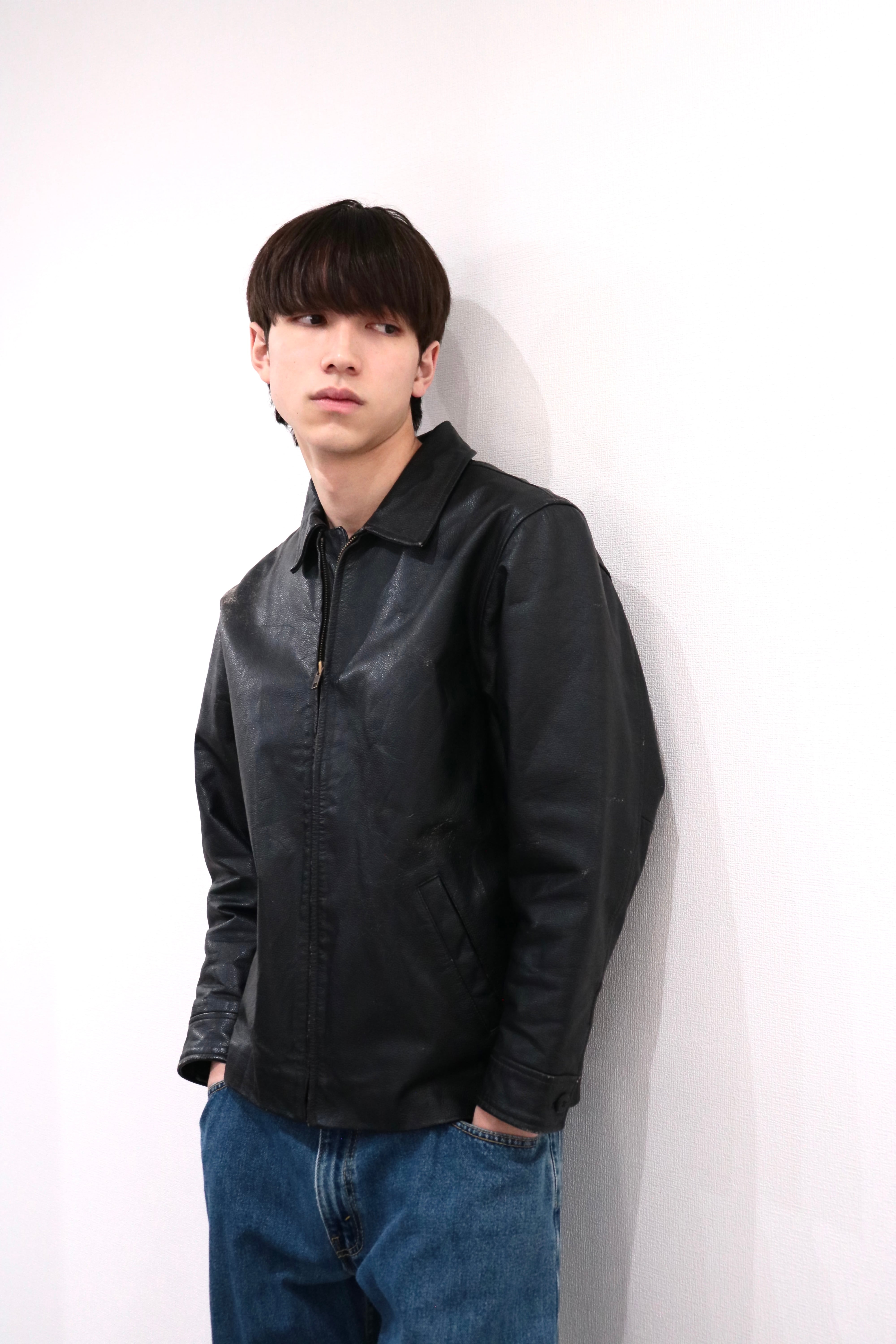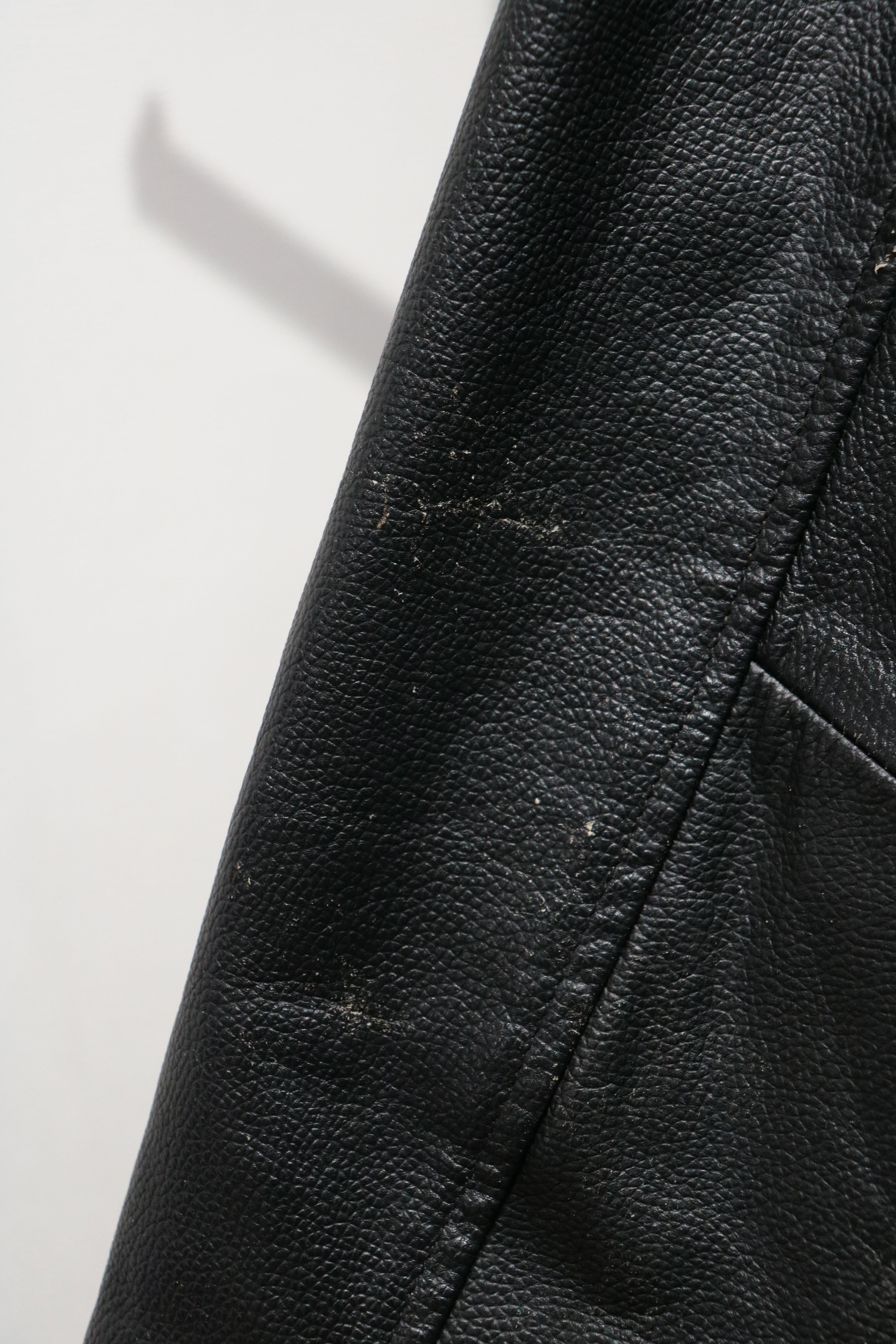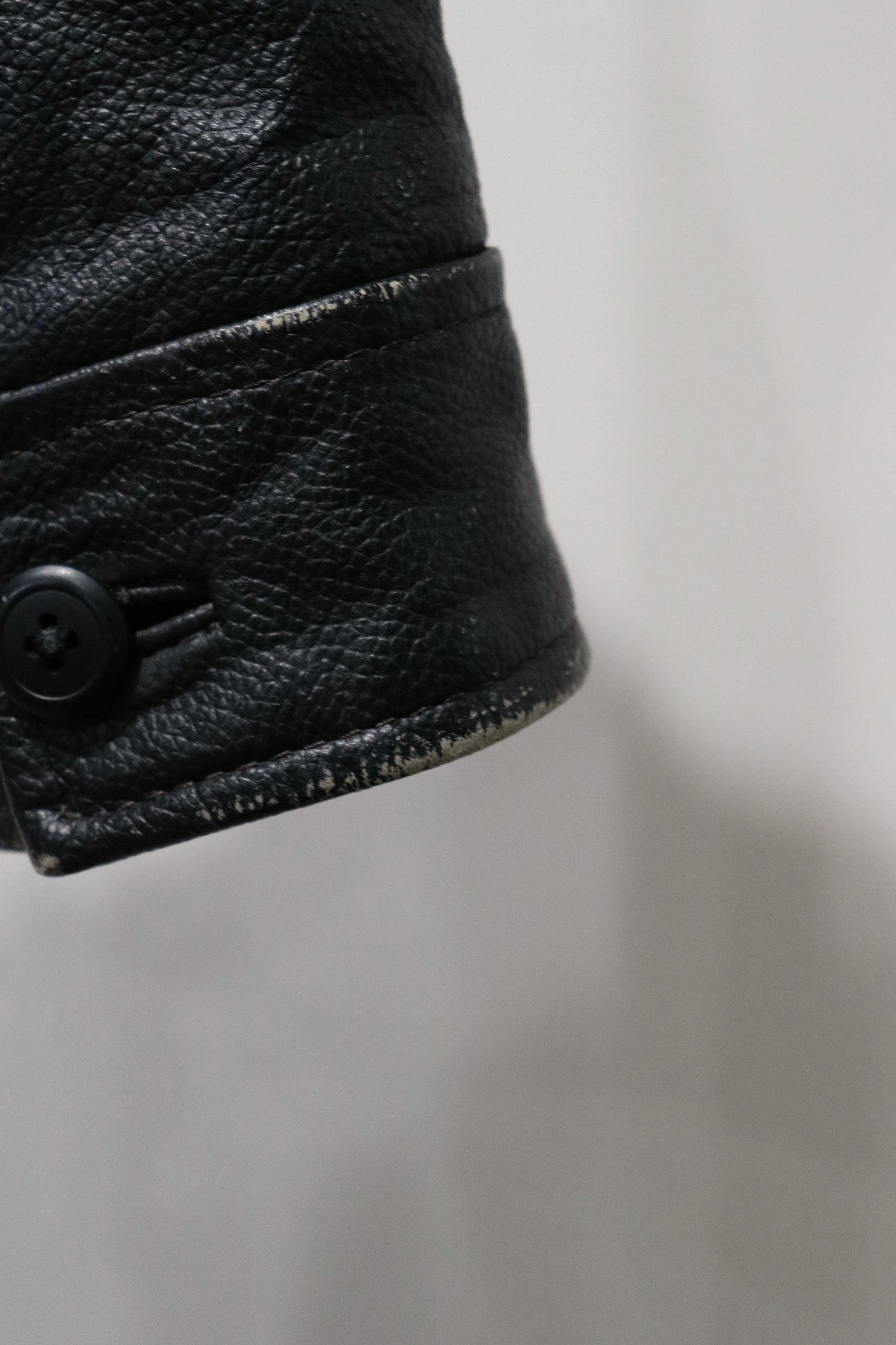 襟付きのシングルタイプ、袖口はカフスが付いたシンプルなデザインです。しっかりとしたカウレザーで、肩や袖口など部分的にスレが見られます。