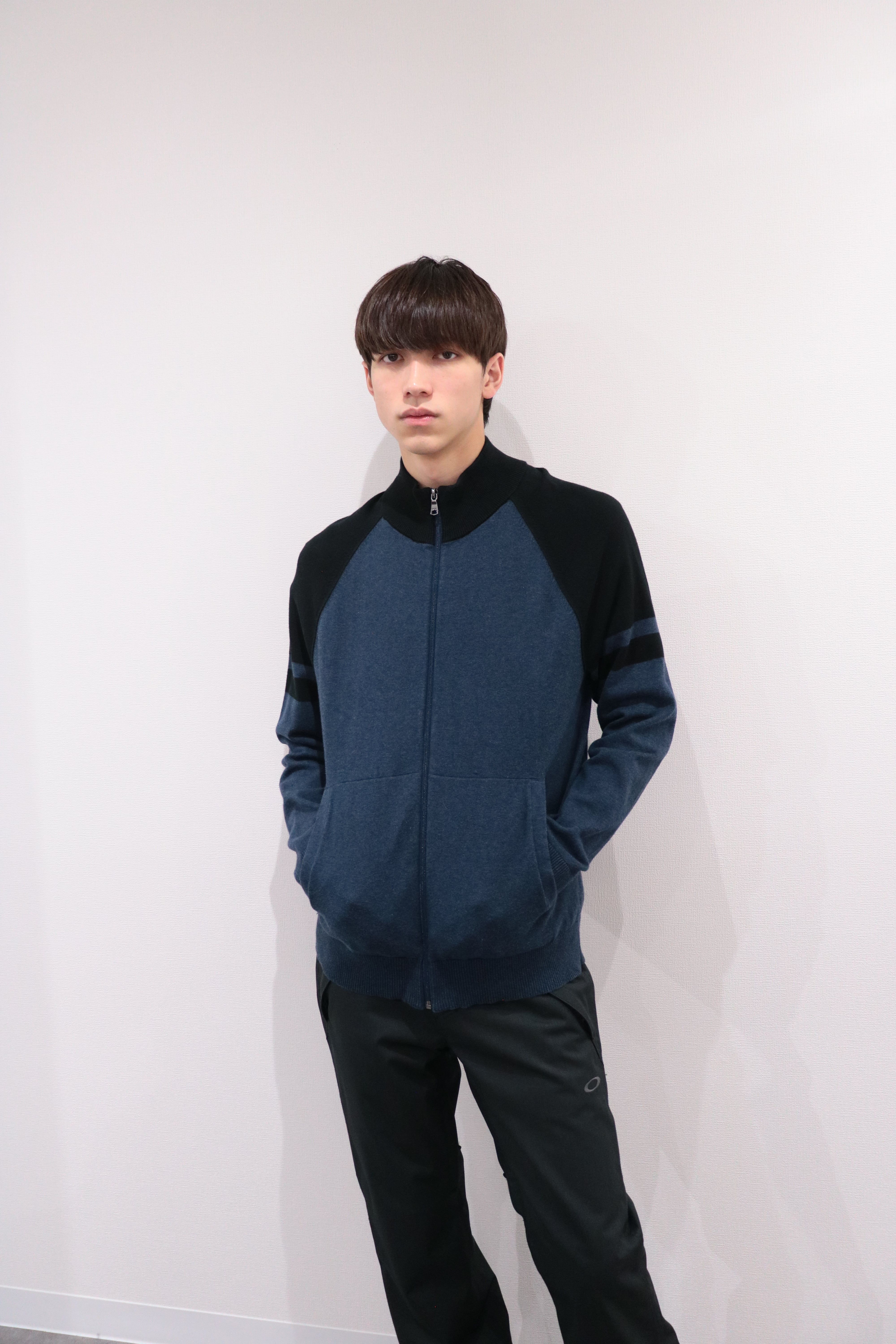 首に沿うようなモックネックで、フルジップタイプのコットンニット。