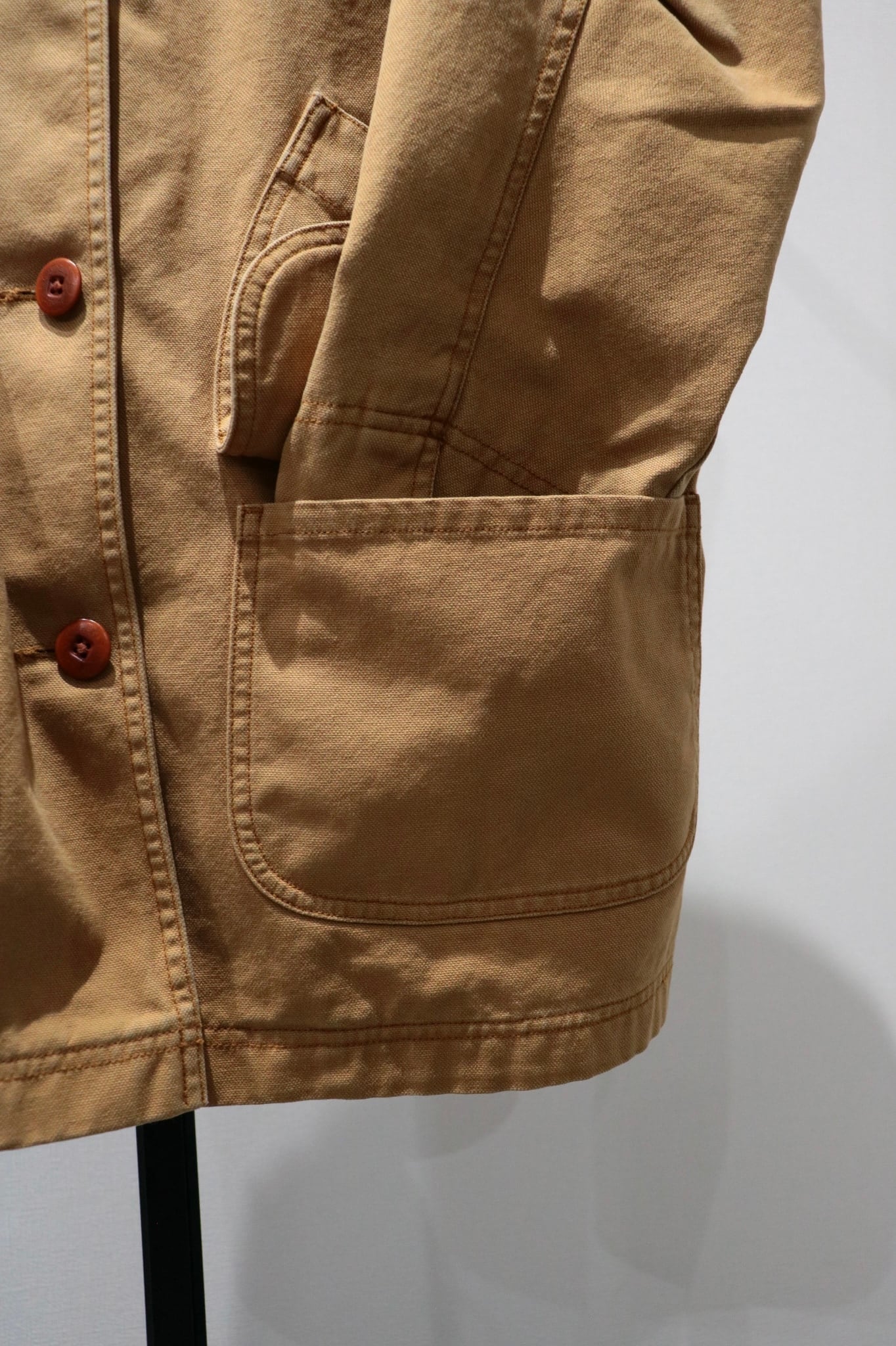 ポケットが縦に2つ並んでいて便利。裏地にはチェック柄のネル素材、袖裏だけナイロンが使われているため着用しやすいです。