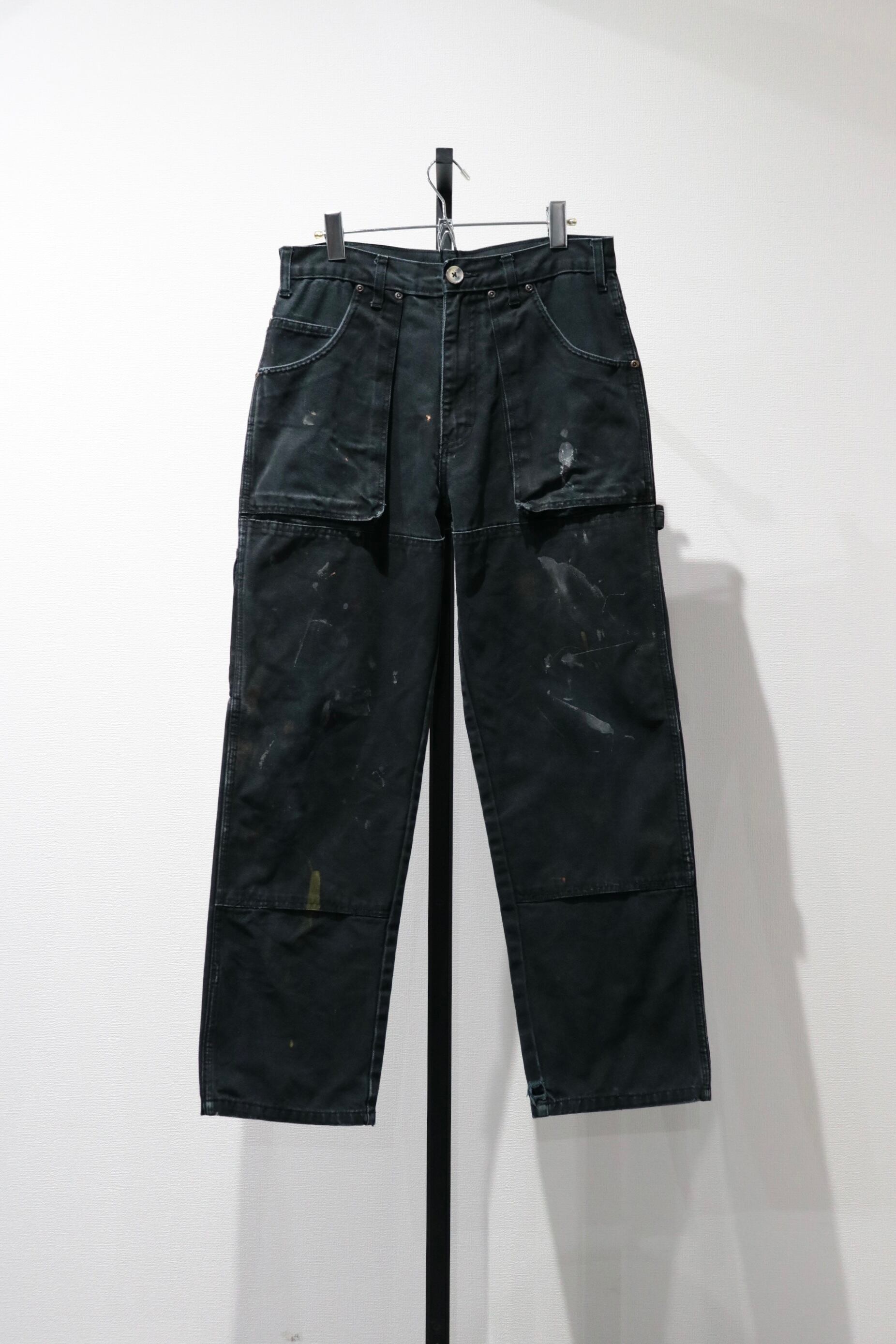 所々にペンキ跡やブリーチによる色落ちが見られます。ダブルニー仕様で、マチのついたサイドポケットが特徴的です。また後ろポケットもダブルになっている面白いデザイン。