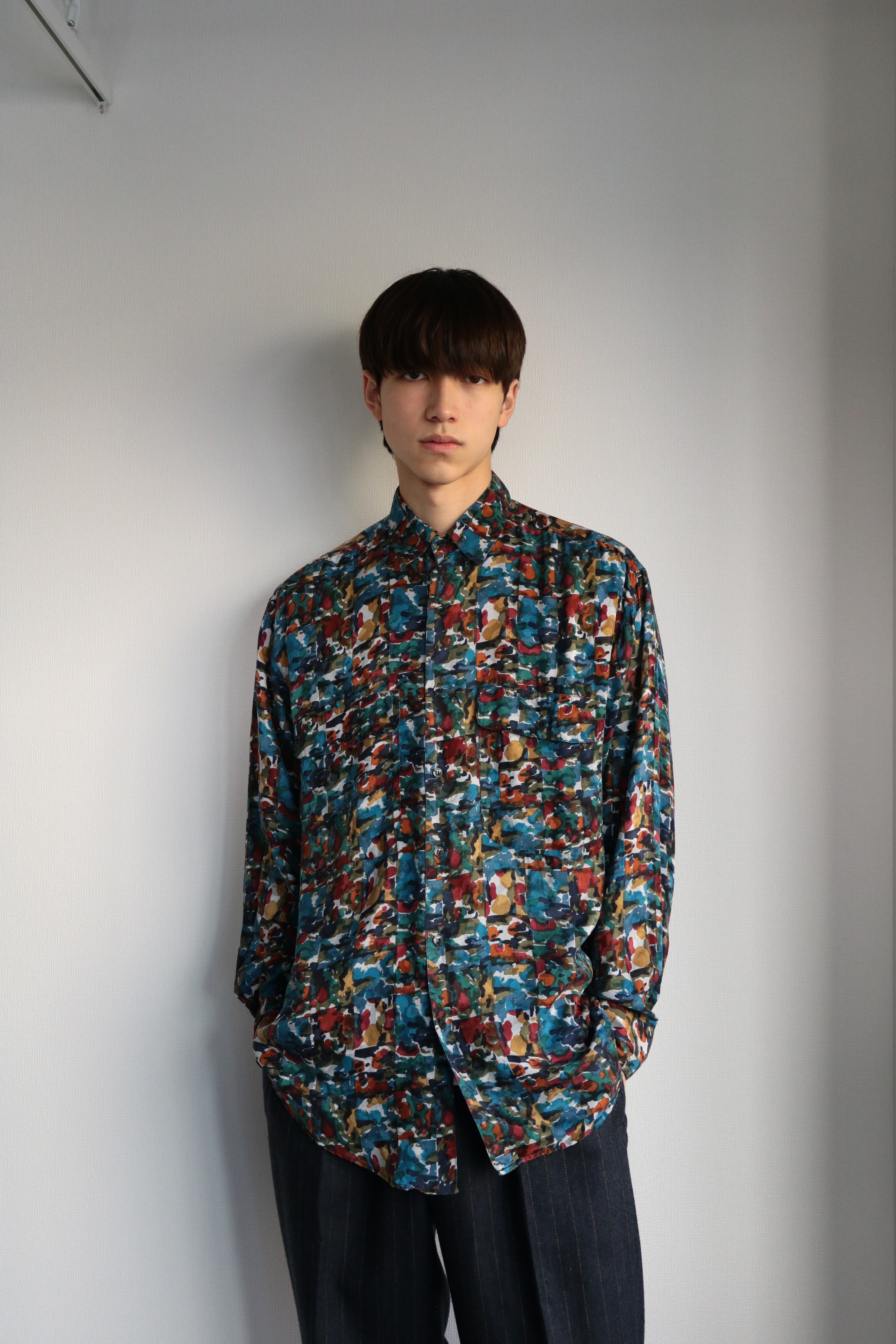 たくさんの色が混ざった柄が全体に広がるシルクシャツ。