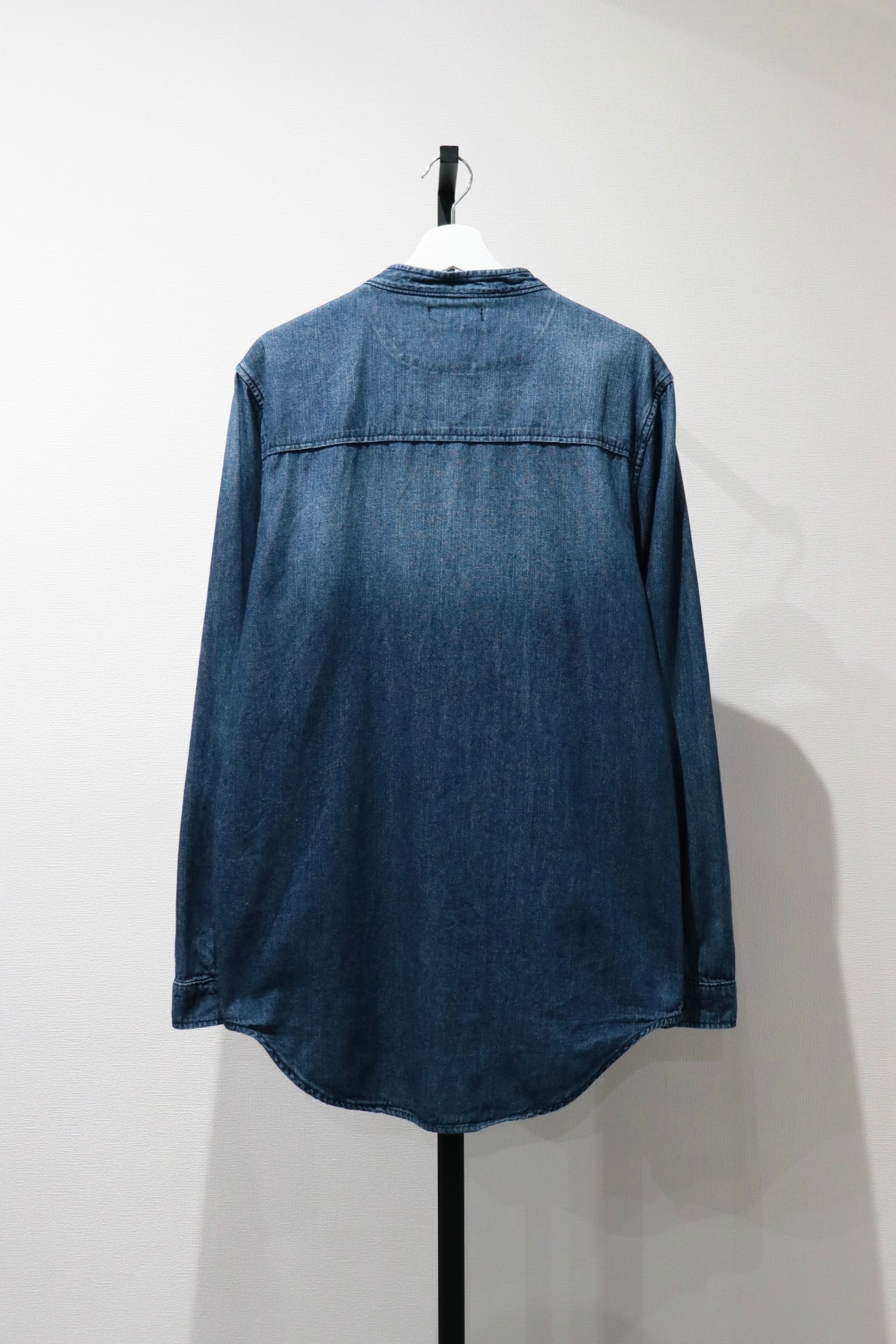 柔らかいデニム素材で作られたノーカラーシャツ。