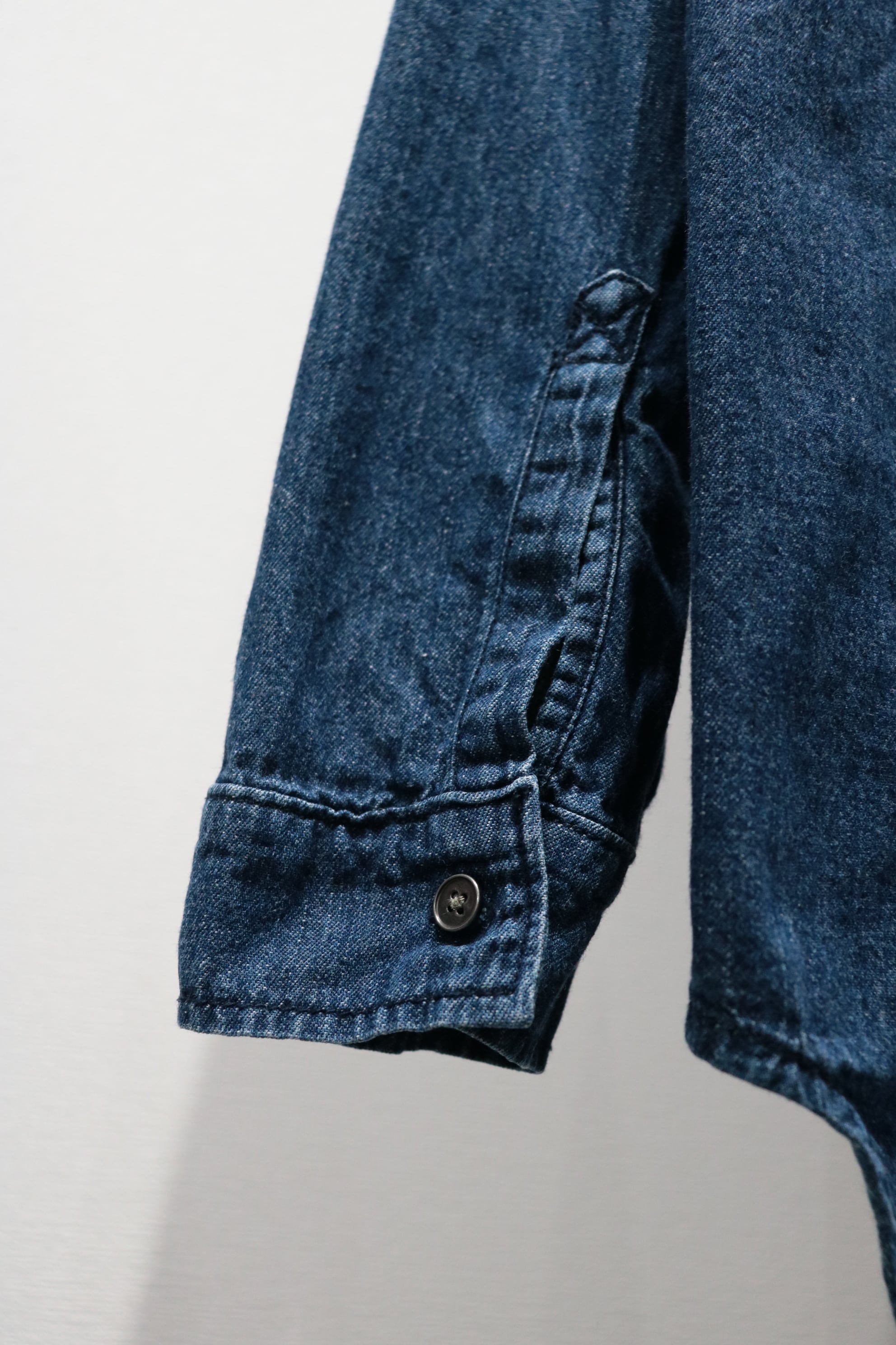 絶妙な色落ち具合で、詰まりすぎていない首元、程よいサイズ感の一枚です。襟がなくなるだけで、普通のシャツとは随分印象が変わります。