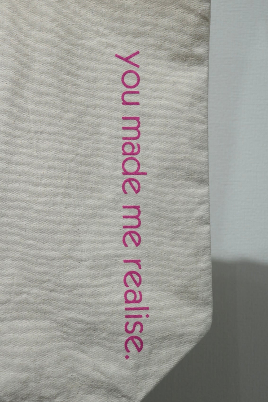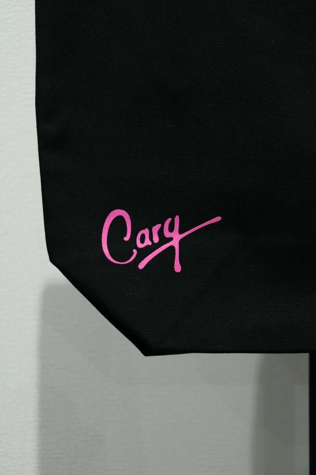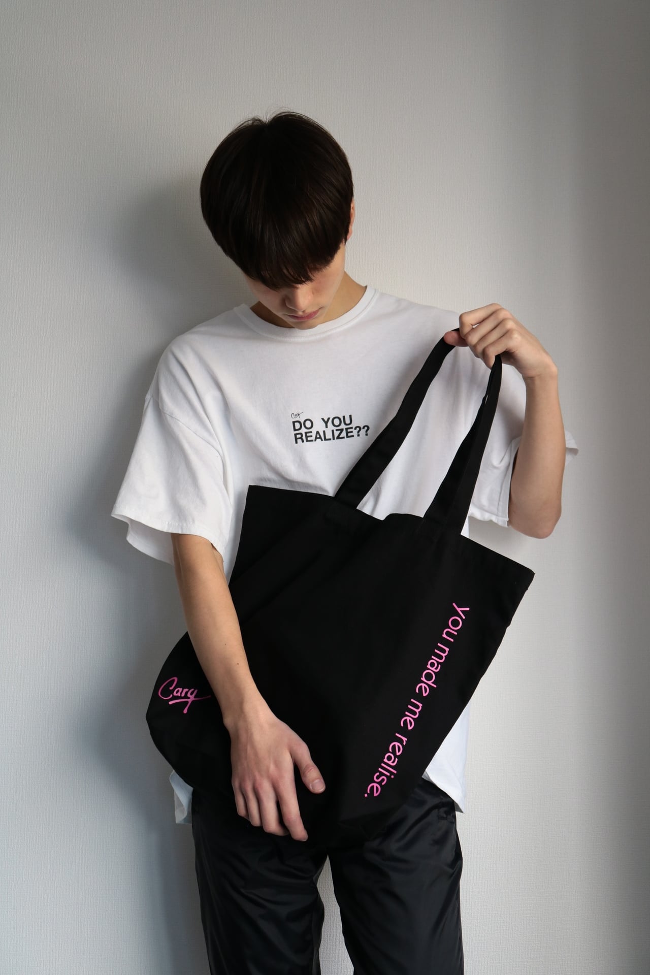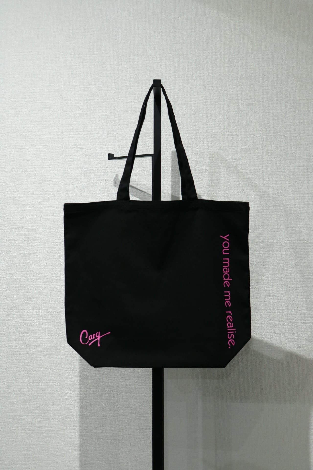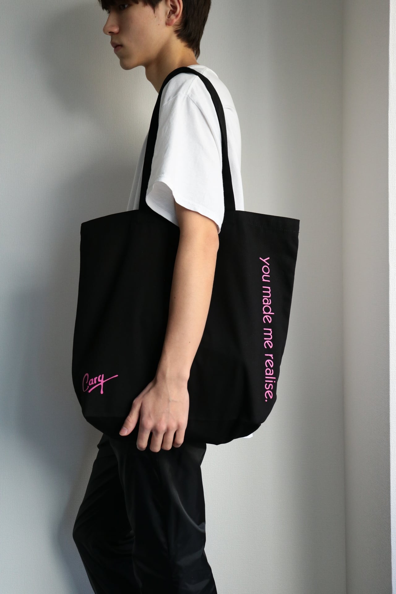 Caryのロゴマークと「you made me realize.」のメッセージが縦にプリントされたトートバッグ。