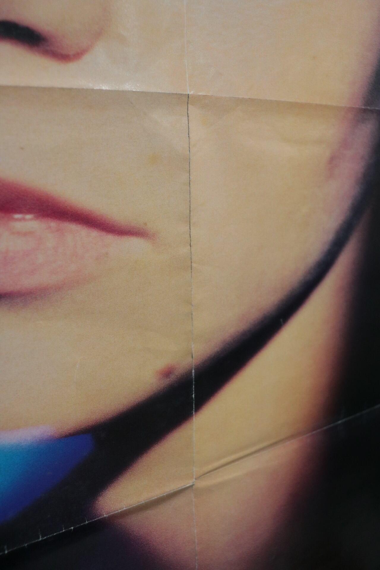 折りジワ部分に若干の破れ、部分的にスレが見られます。