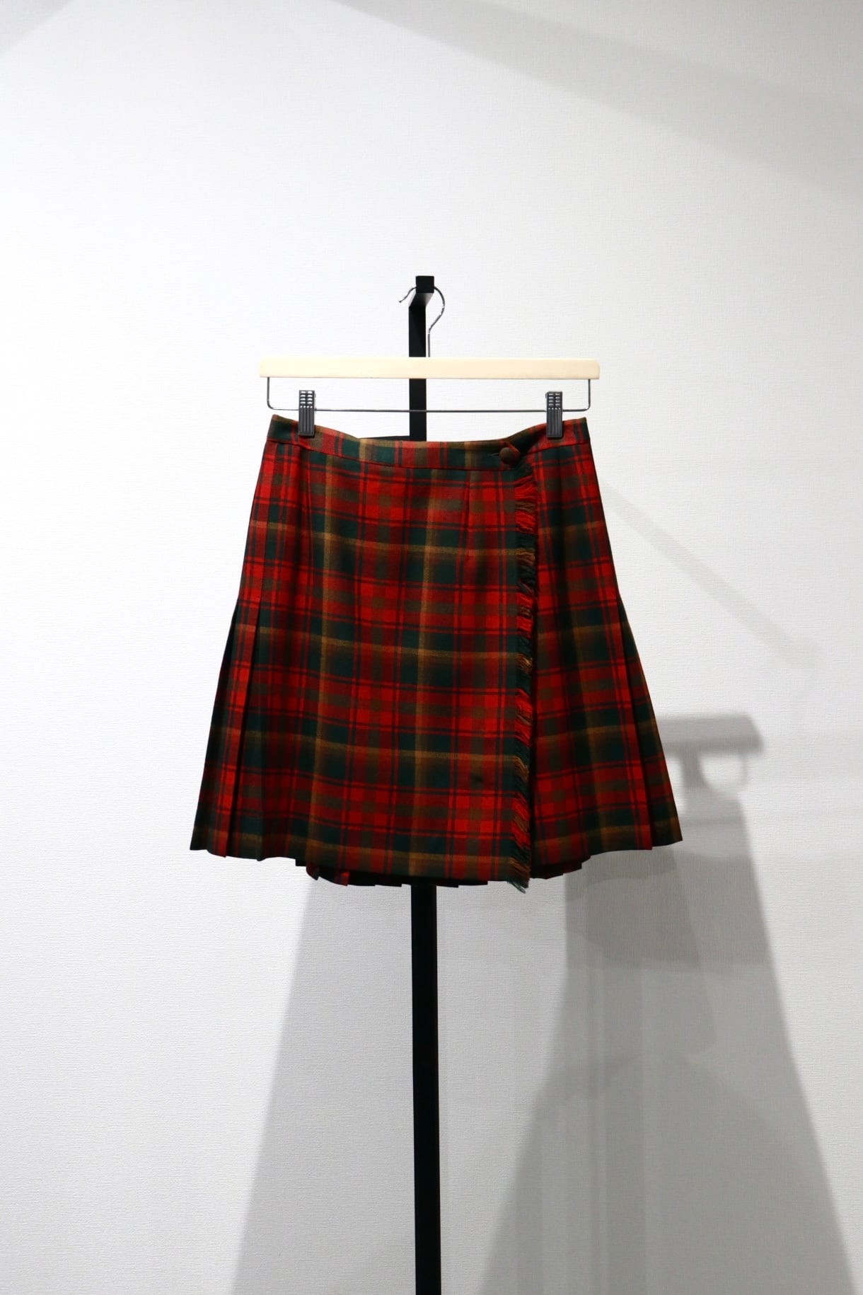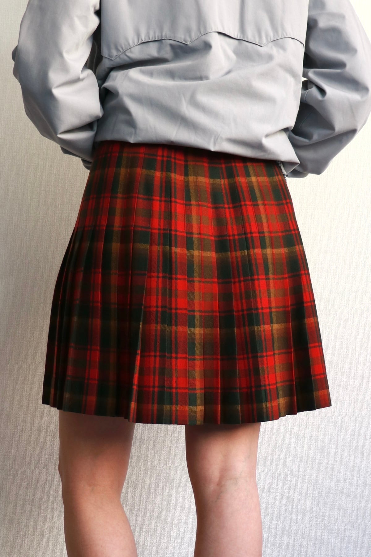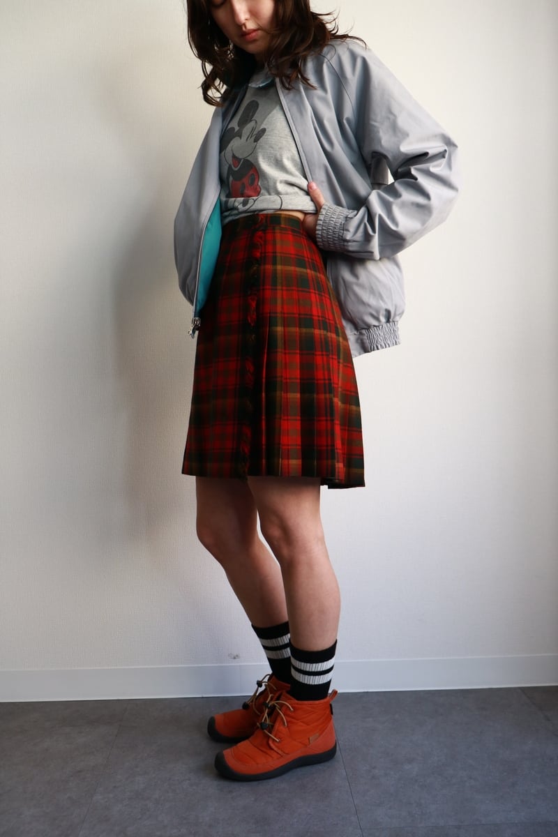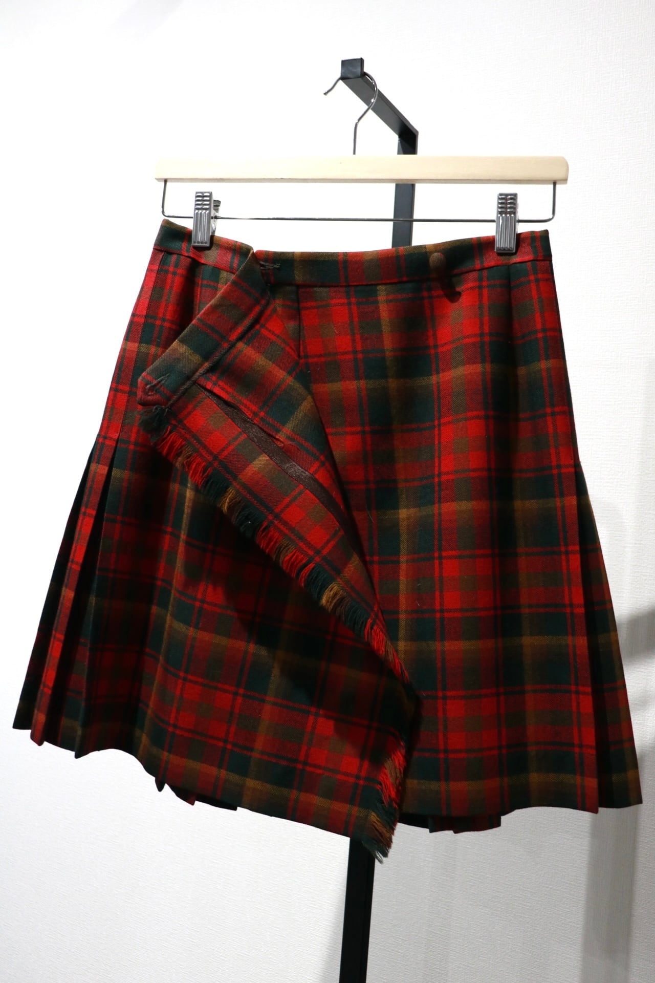 赤いチェックの巻きスカート。全面はフラットで後ろ半分にプリーツの入ったデザインです。