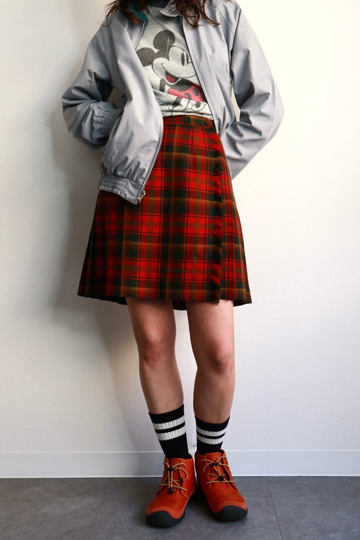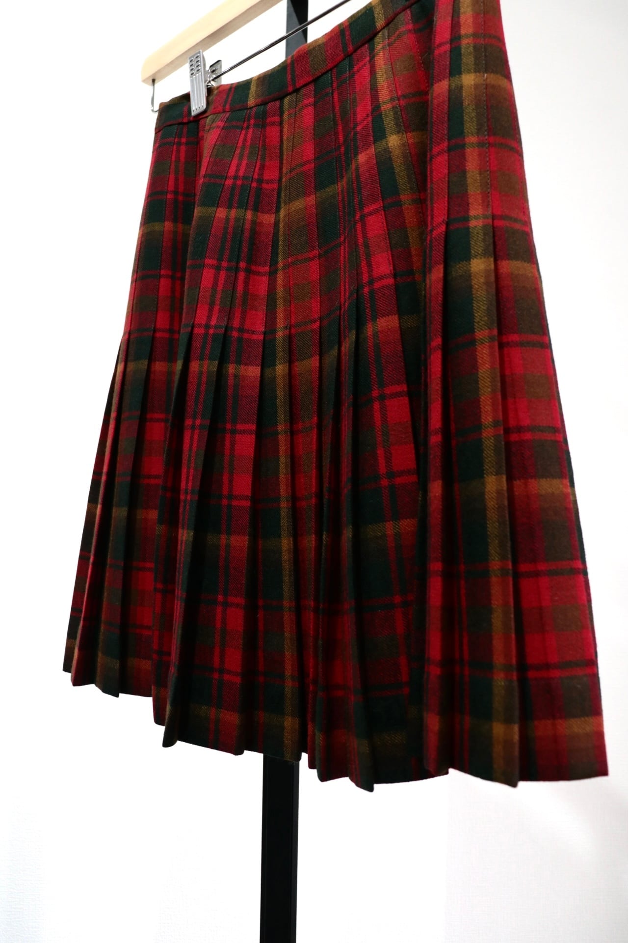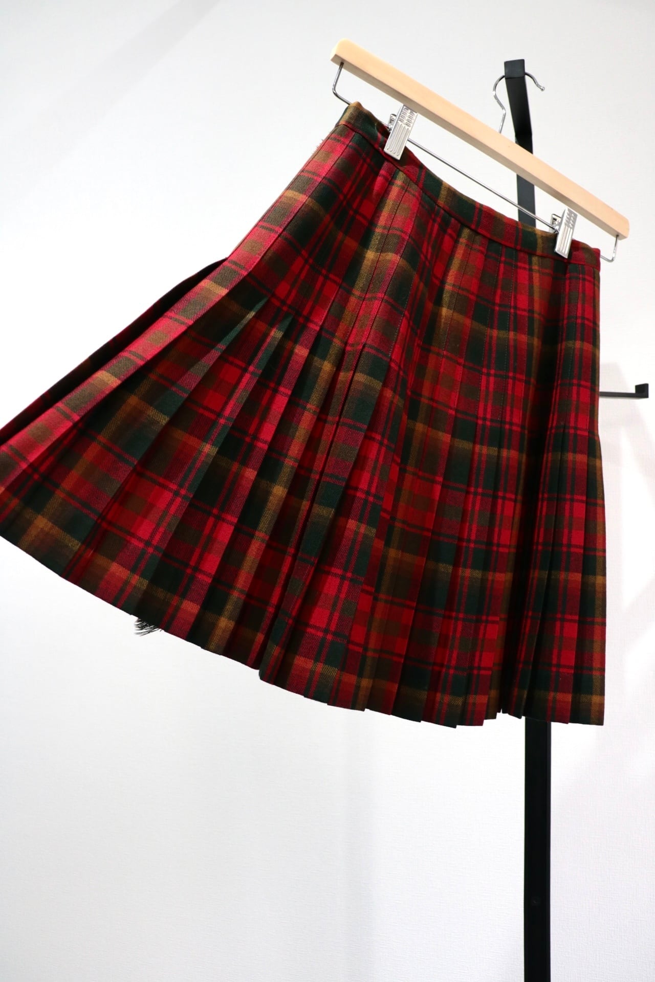 赤いチェックの巻きスカート。全面はフラットで後ろ半分にプリーツの入ったデザインです。