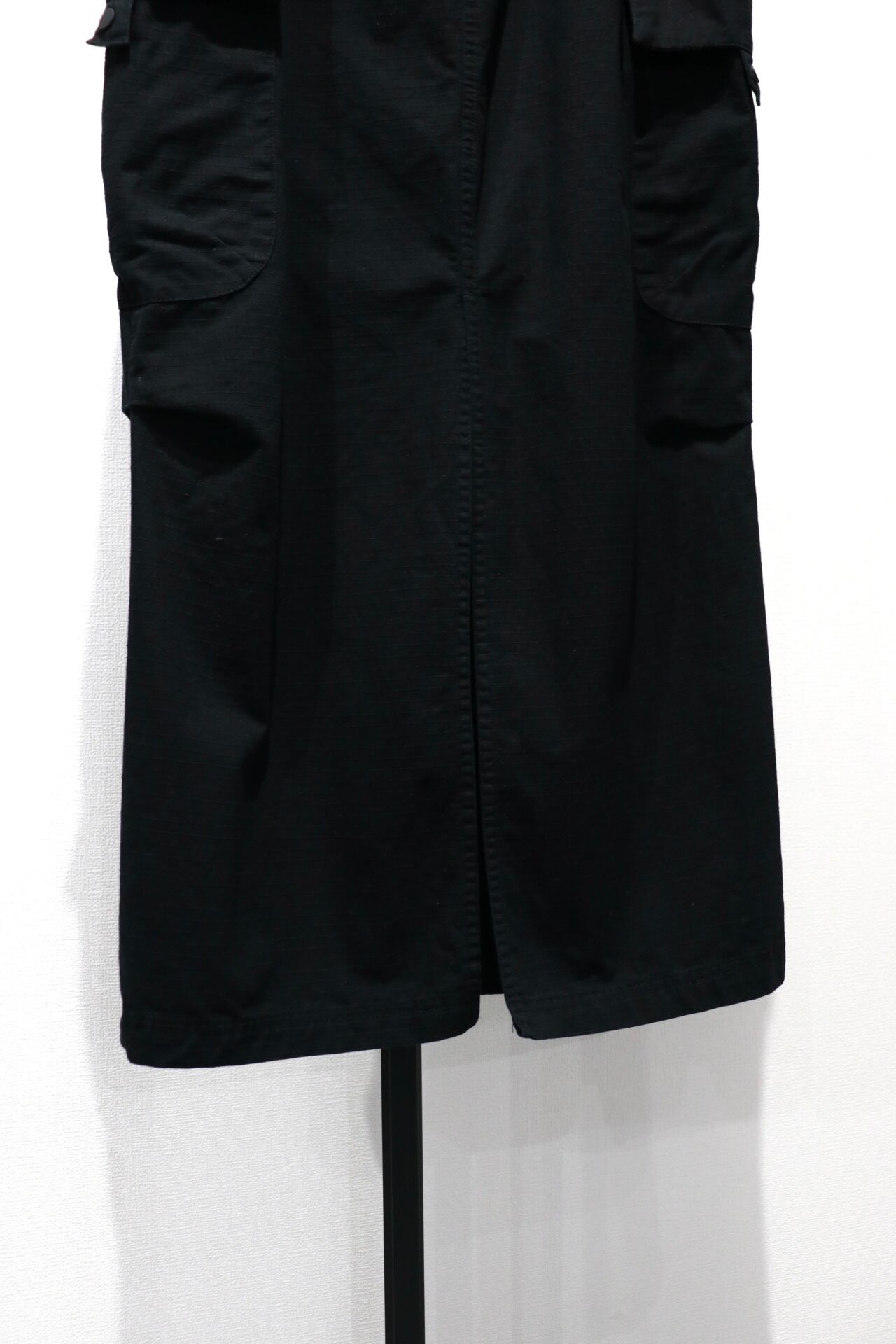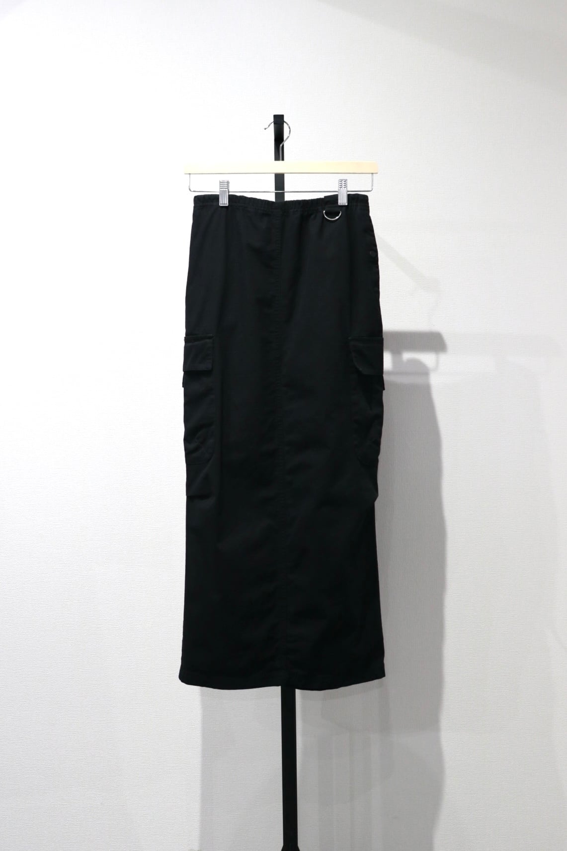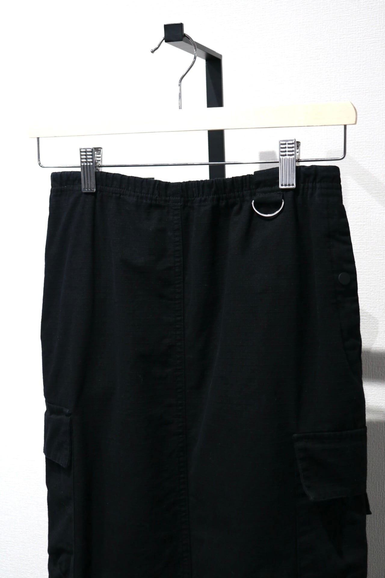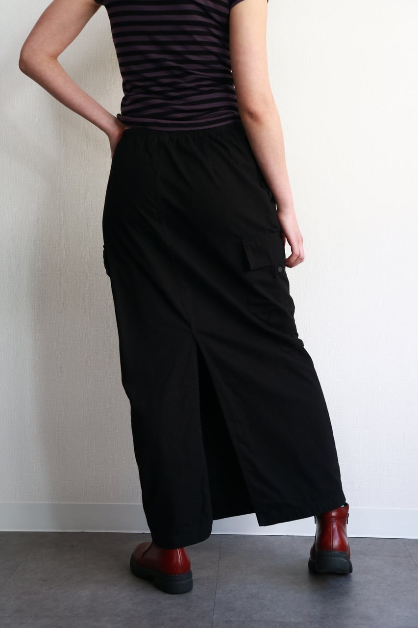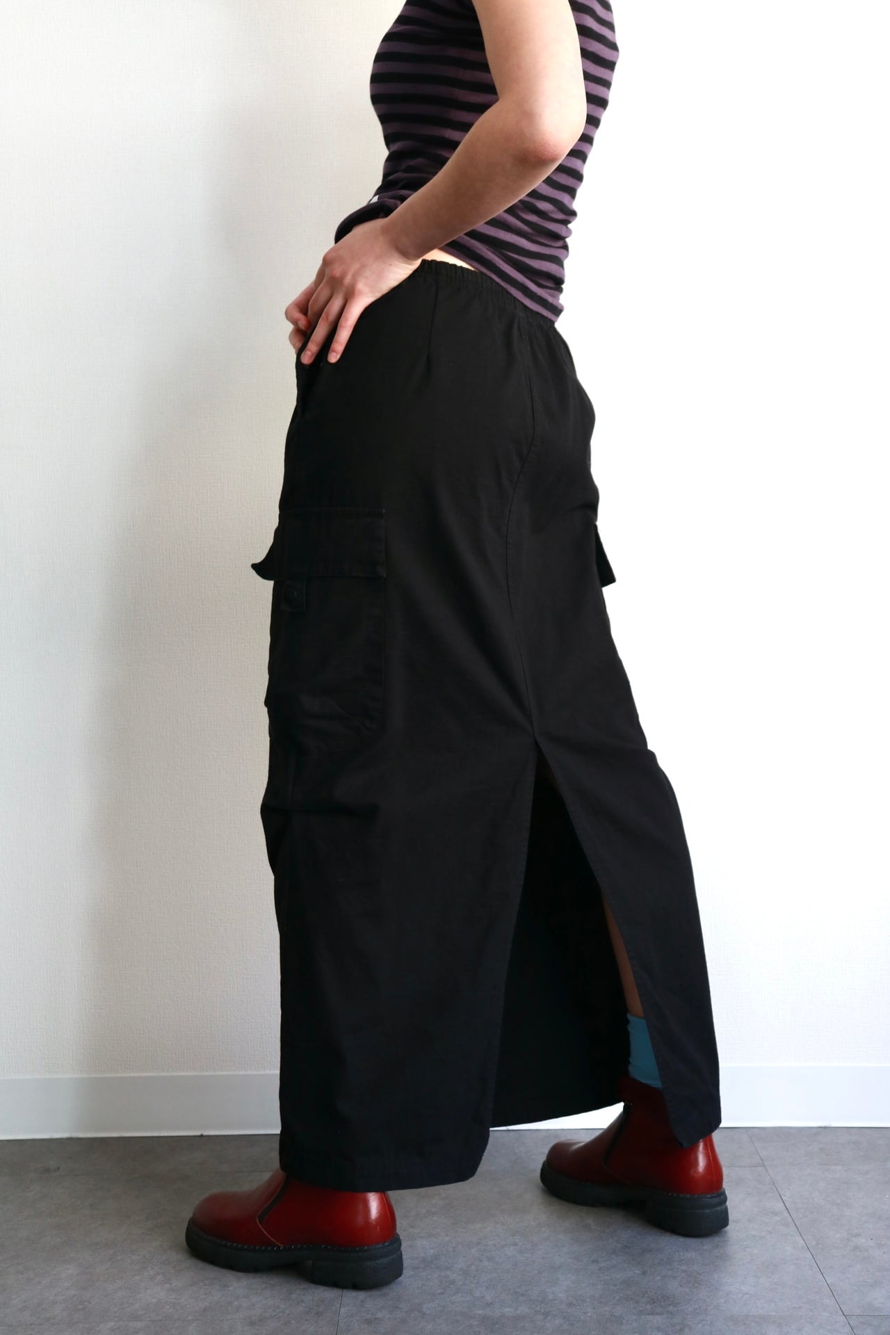 両脇に大きめのサイドポケットが付いた、真っ黒なカーゴスカート。素材には丈夫なコットンのリップストップ生地を採用しています。