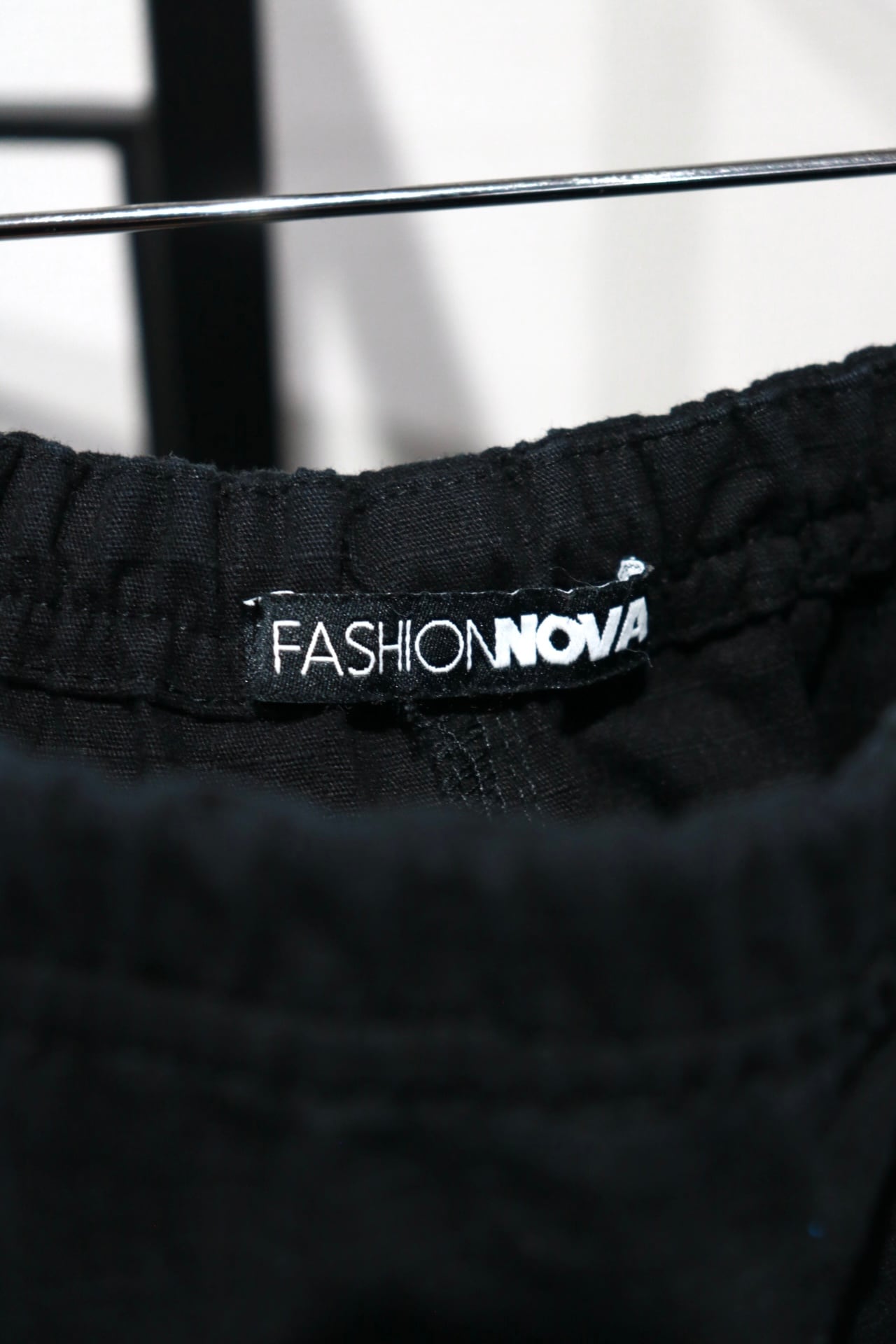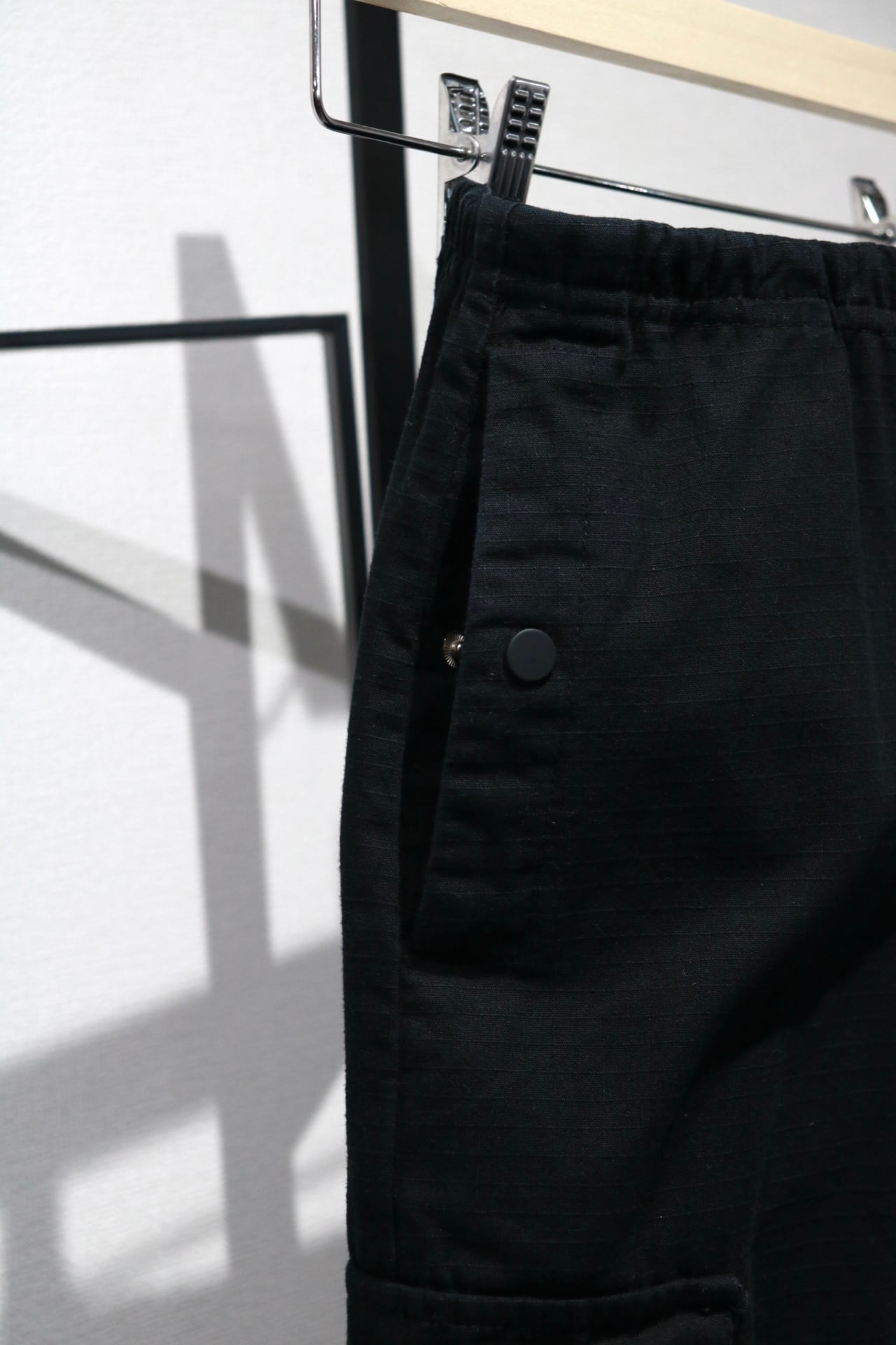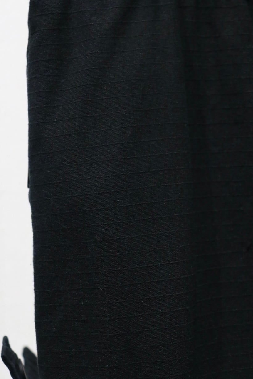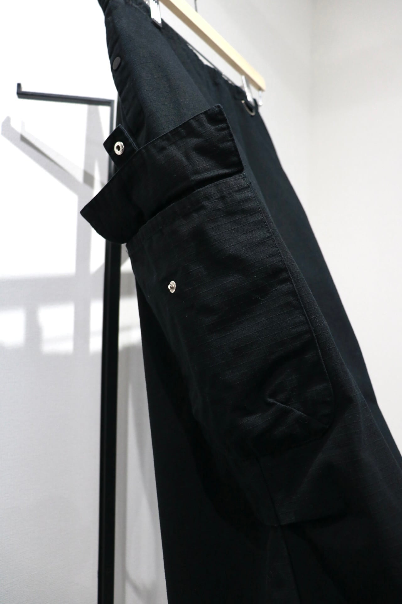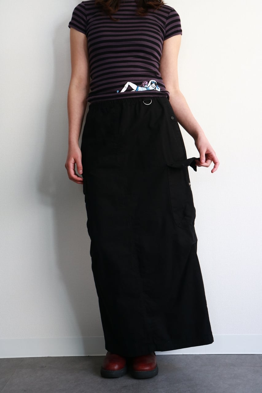 両脇に大きめのサイドポケットが付いた、真っ黒なカーゴスカート。素材には丈夫なコットンのリップストップ生地を採用しています。